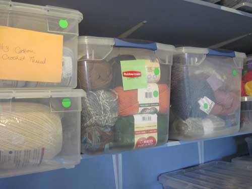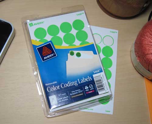 And I had purchased some bright green dots to put on each skein as it was counted, as well on the containers that were filled with inventoried yarn.