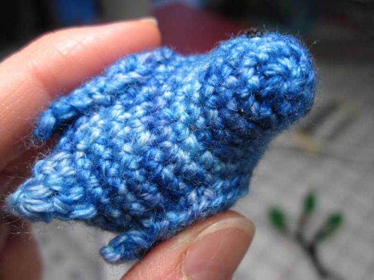 I stuffed the bird as I worked to check the shaping, and would pull out enough stuffing to continue working. After completing the last round for the body I closed the seam on the bottom with a whipstitch.