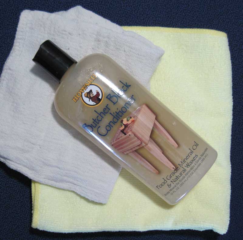 I warmed the oil a little by placing it in a container of hot water. Then rubbed it into the wood with the white cloth (just a rough cotton cloth sold in the painting department of my local DIY store) followed by polishing it with the yellow microfiber cloth.
