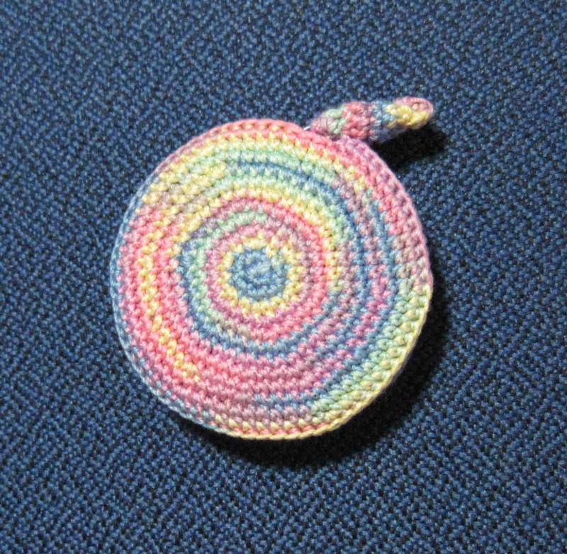 I began with the plain side of the tape measure. I started a simple single crochet spiral round and kept holding it up to the tape casing to see if it was big enough. My spiral tended to “dome” a little in the center, so I wanted to have the final circle be small enough that it would fit tightly around the casing.