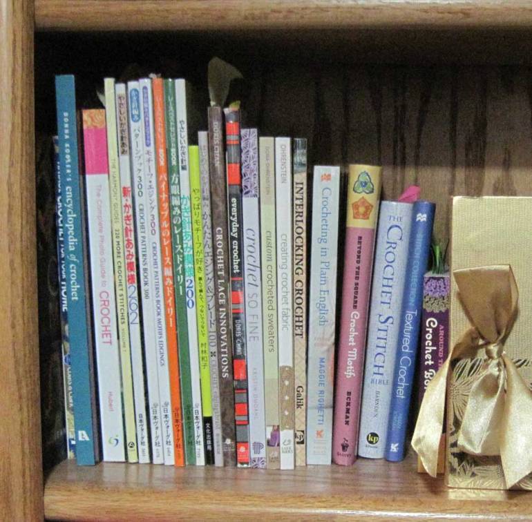 This is the shelf full of books just to the left of my computer desk/work area in our house. These are not my only books in my library, crochet or otherwise, but they are the ones that I am currently either referring or fascinated by that I need them handy. Of course, I may have more to add to there before this trip is over.
