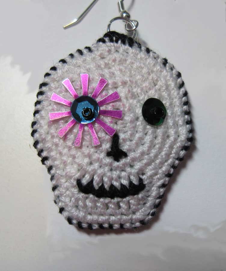 I had a lot of fun making these earrings. The skull is crocheted in Size #10 Aunt Lydia’s Classic Cotton thread, and is only 7 rounds. Then the real entertainment begins, Embellishment!