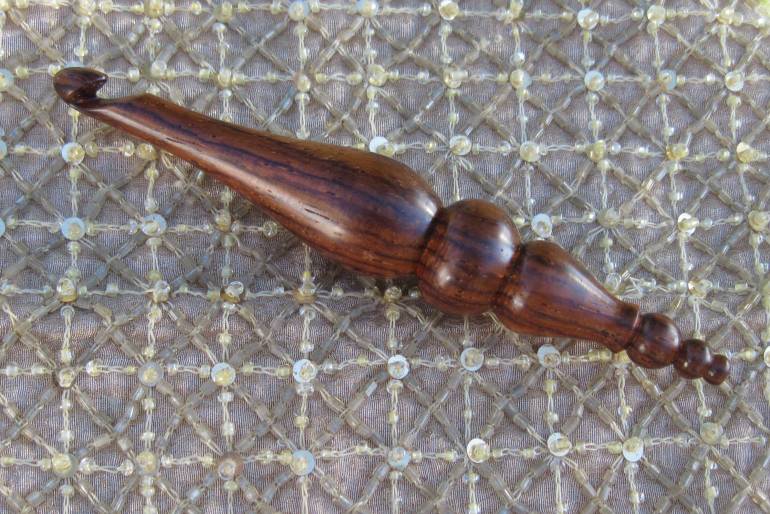 Harrison can measure your hand and create a hook that is the perfect fit for you. Mine arrived this past Monday in the mail. It is so beautiful, I don’t know if the photograph can do it justice. It is made from a piece of Mexican Cocobolo wood, the finishing polish is so smooth that the wood seems to glow from within.