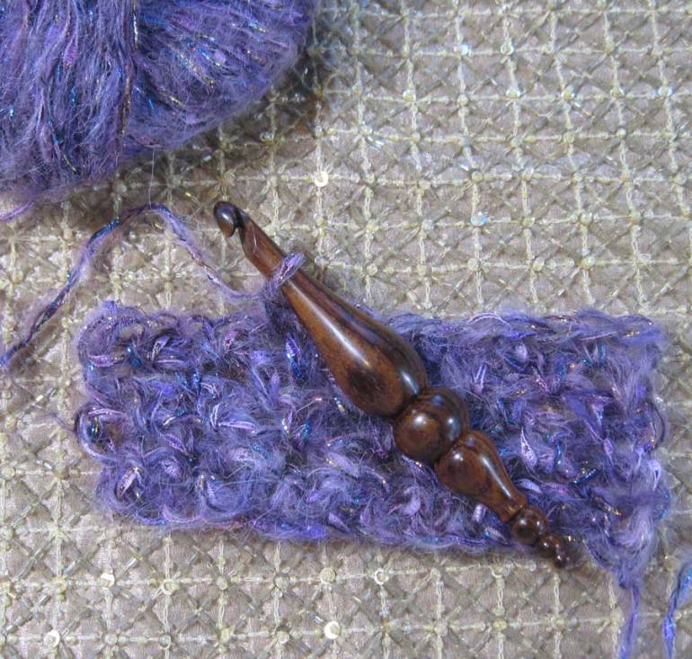 Of course, a luscious hook like this needs some equally luscious yarn for its first test drive in my hands. So I picked a ball of gorgeous Artful Yarns “Heavenly” a novelty style yarn with fluffy mohair and sparkles that makes me happy just to look at. It was interesting crocheting with this hook. Took me a moment to get used to the feel of the hook, as it is much shorter than most of the hooks I normally work with and it doesn’t have any sort of thumbrest.
