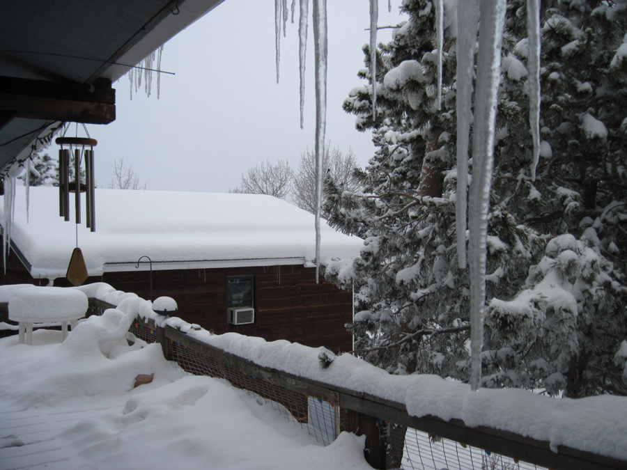 I took another photo this morning before the icicles could get broken. You may not be able to tell, but it was still snowing. As I write this it continues to snow and the temperature has gotten all the way up to 20F.