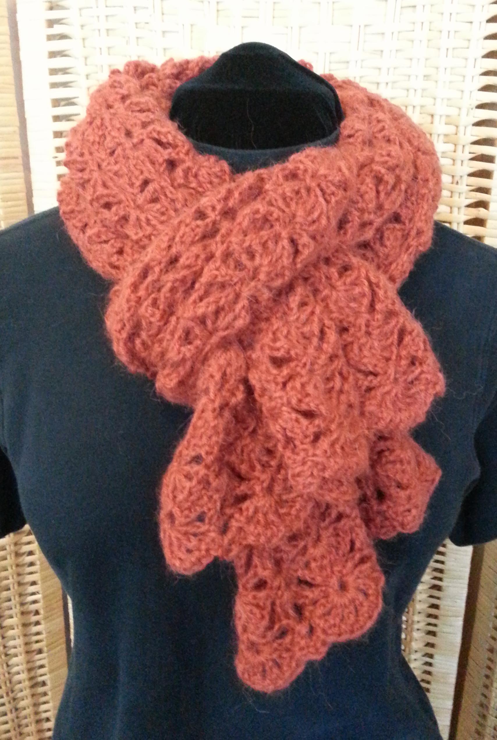 The wrap is worked outward from a central back foundation in 2 parts and requires no finishing other than weaving in a few ends. It only takes 2 skeins of yarn, 1 skein for each half. The lacy stitch pattern makes for a lot of fabric without a lot of bulk.