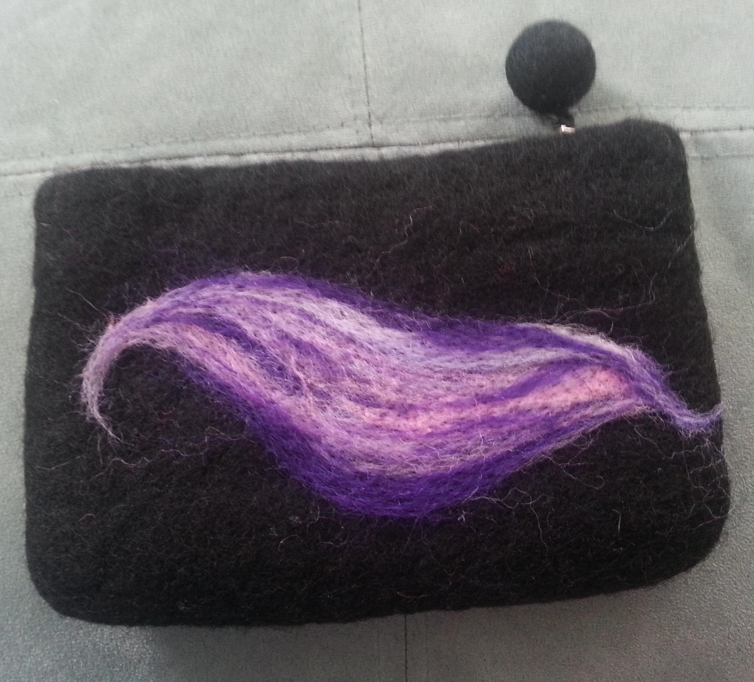 For the needle felting we were using the little felt bags that were in our goodie bags from the shop. Jan wasn’t going to the morning activity so she gave me her little felt bag to play with. I decided I would make a design on it and give it back to her.