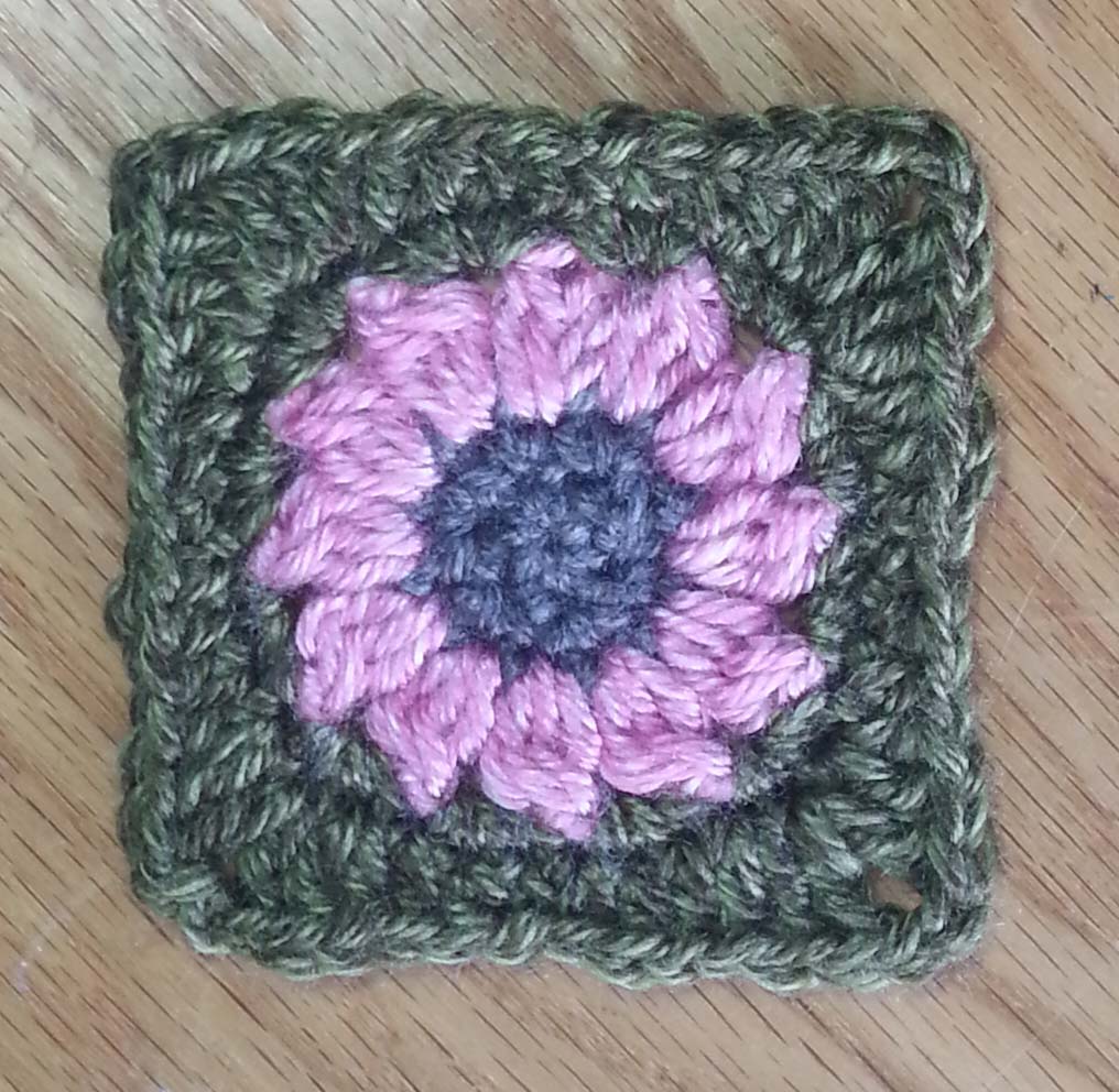 Color 3 for Square border: Approximately 9.5 yards for Rounds 4 and 5 (I usually pick a color in the green range since I consider these rounds to be the “leaves” of my flower). (Sample shown uses Lion Brand “Heartland” yarn in color #174 Joshua Tree)