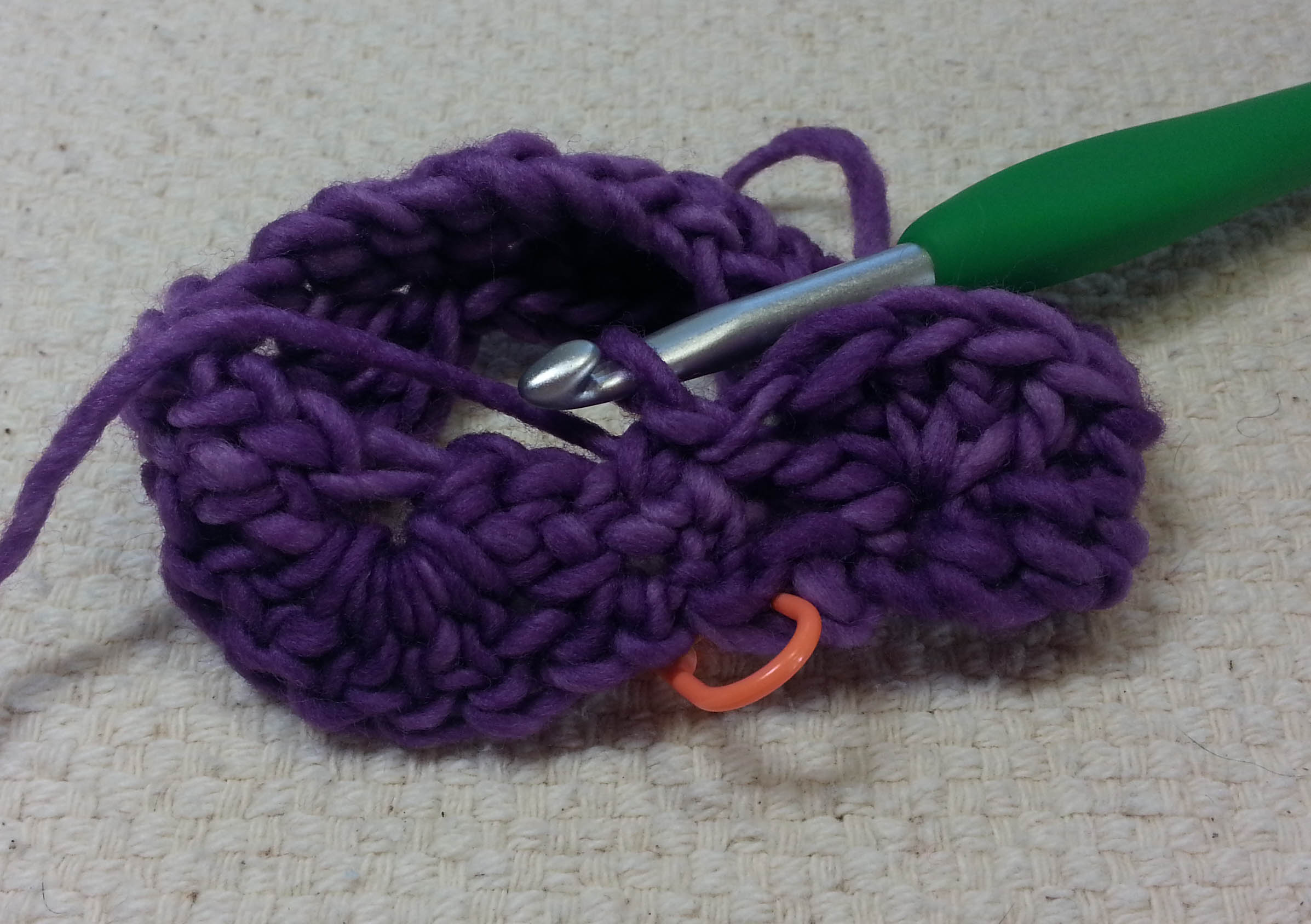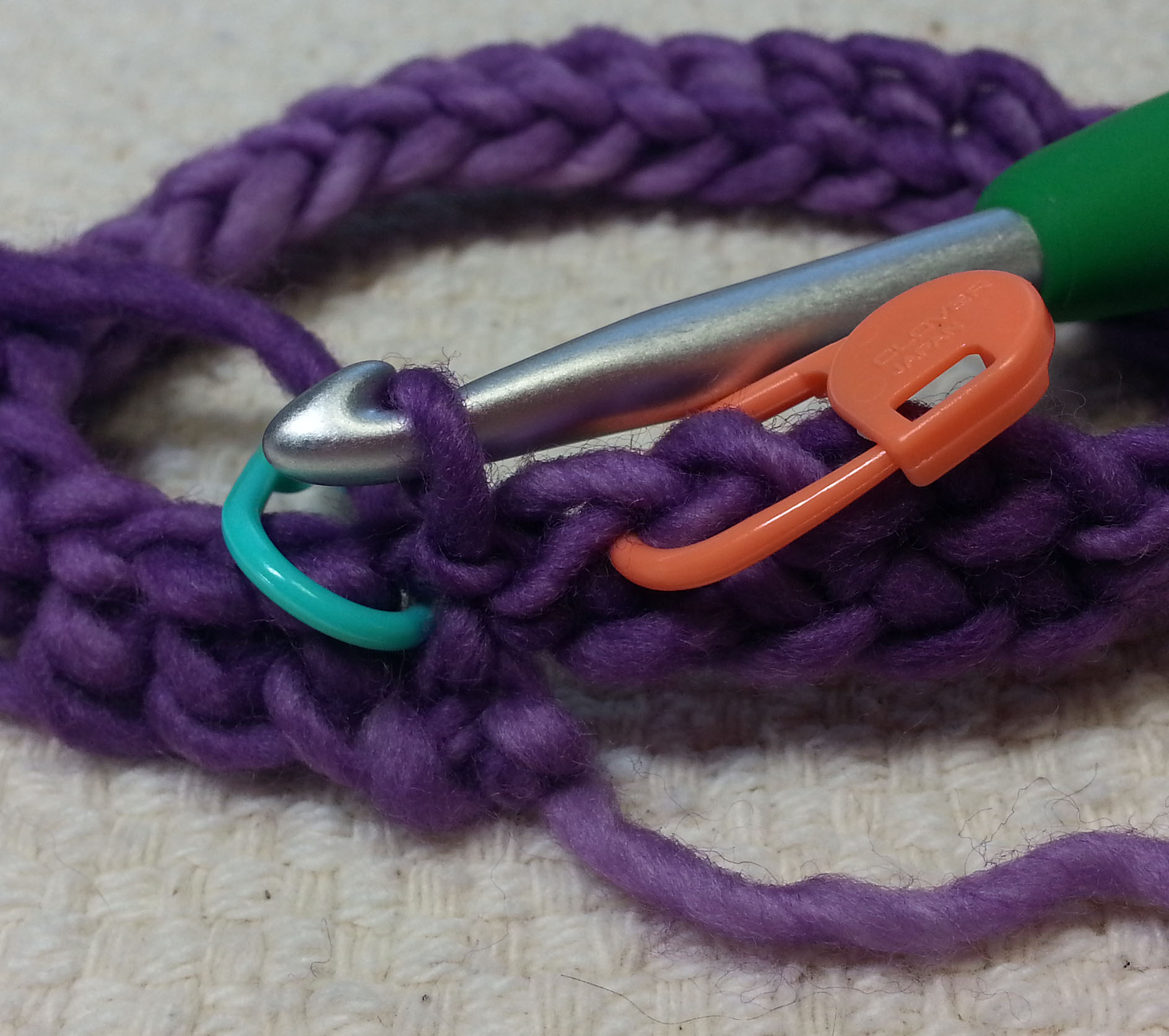 When you finish the length of foundation single crochet that the pattern specifies lay it out flat. The stitches have a top and bottom. The green stitch marker is in the bottom of the first stitch and the orange marker shows the top of the last stitch.