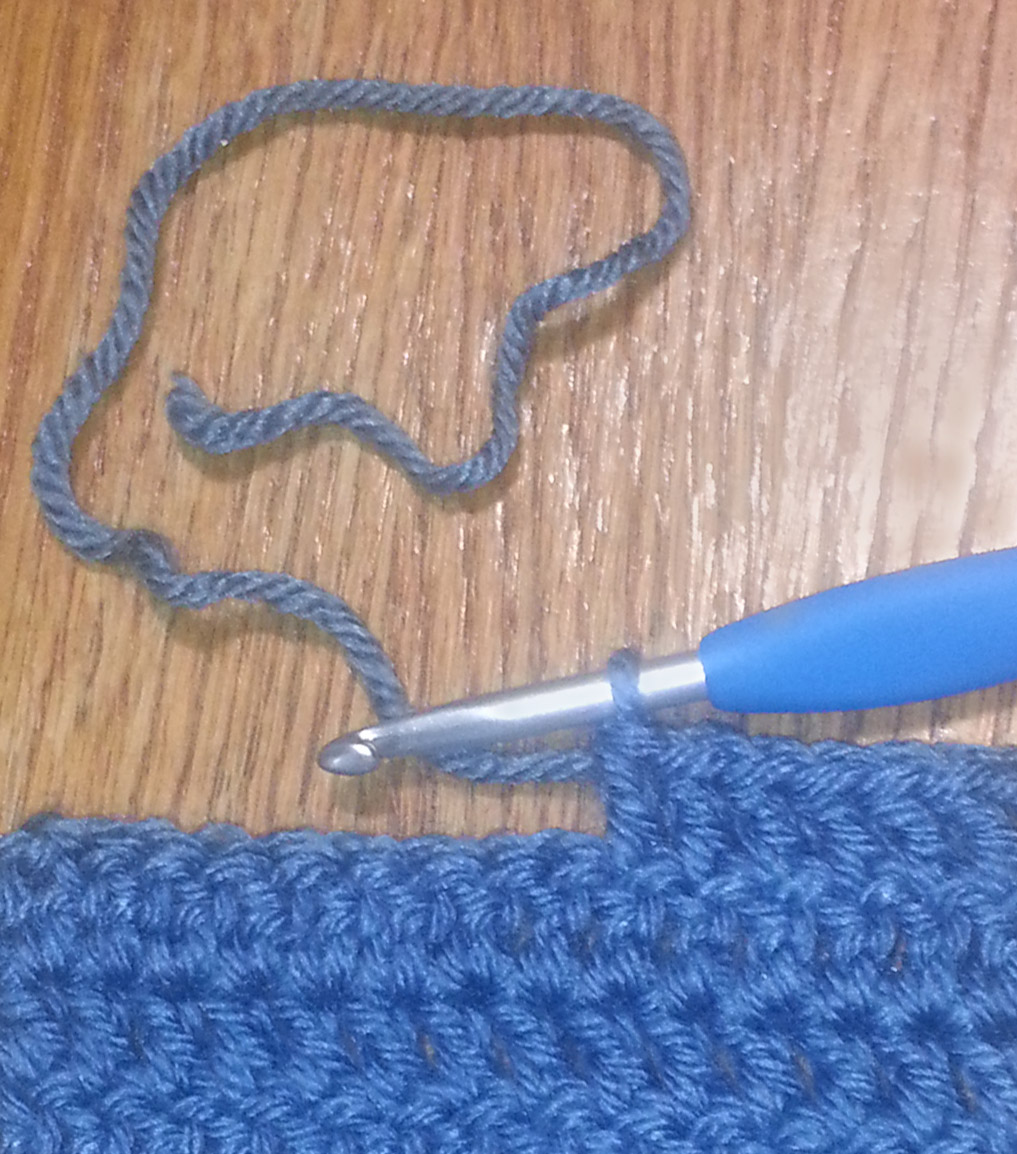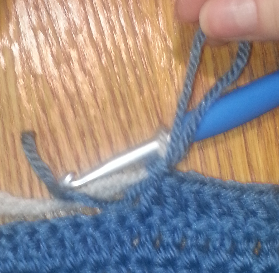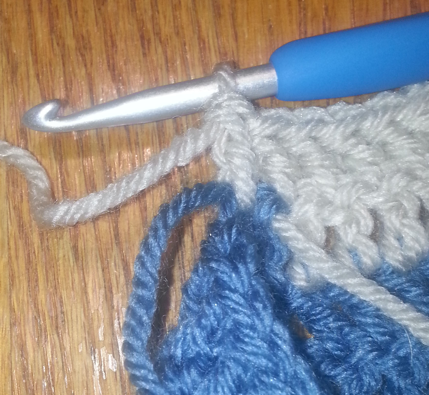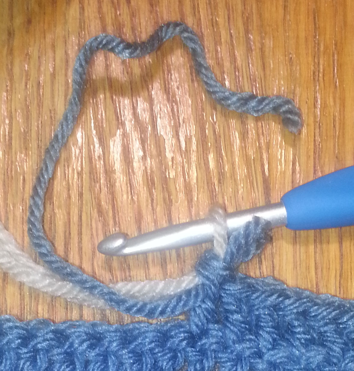 Pull your last yarn-over and the new yarn thru the final 2 loops on your hook, this is the part where you have to hold your mouth just right. You’ll have 2 loops on your hook once the double crochet stitch is completed. If you’ve pulled the yarn thru right the back loop is your old yarn and the front loop is the new yarn.