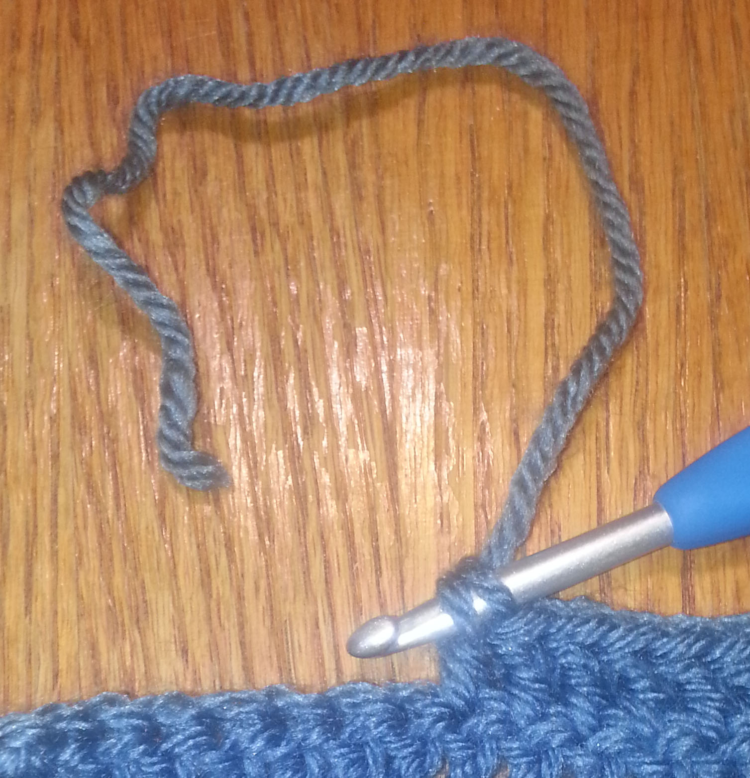 I start my next double crochet stitch with my ending tail. Yarn over, insert in next stitch, Yarn over, pull up a loop, yarn over, pull thru 2 loops on hook, yarn over, (here’s where the fun starts) lay the fold in the end of your new yarn over the hook behind the loop nearest the throat of your hook,