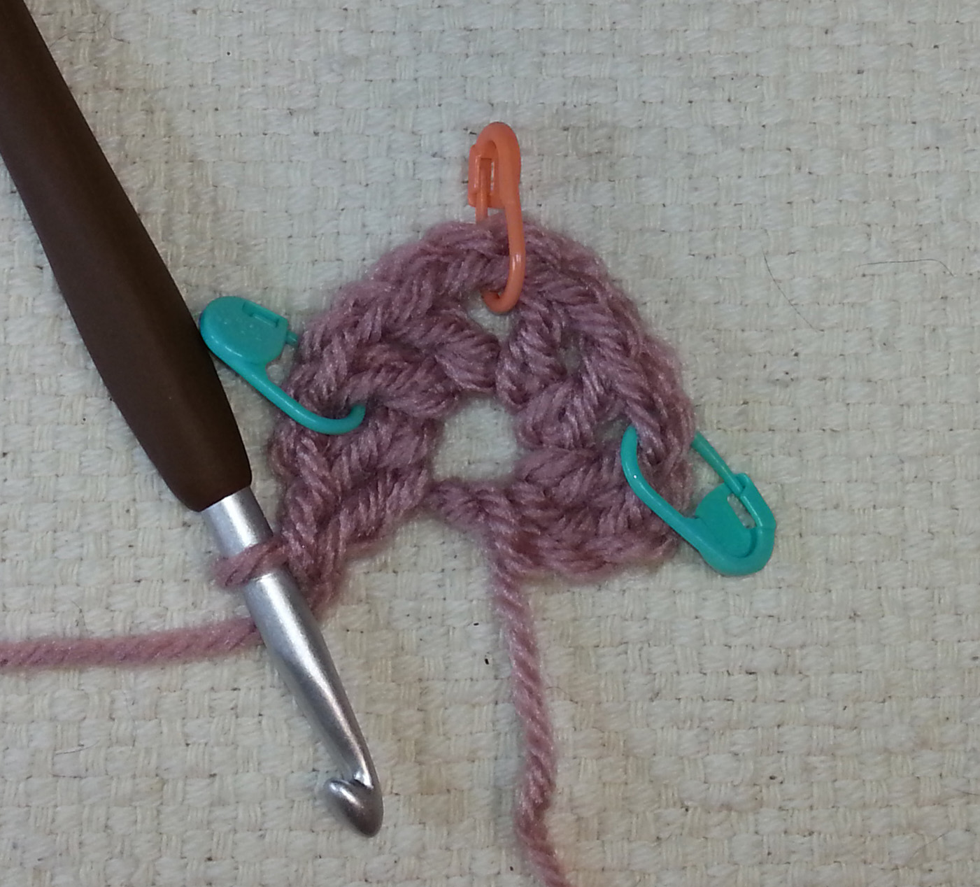 Row 1: Starting with an adjustable slip knot Ch 4 (counts as dc and center), ({dc, ch 1} 2 times, dc, ch 2, {dc, ch 1} 2 times, 2 dc) in fourth ch from hook. Place st markers in first and last ch-1 spaces, and in ch-2 sp. (4 ch-1 sp, 1 ch-2 sp, 8 dc)