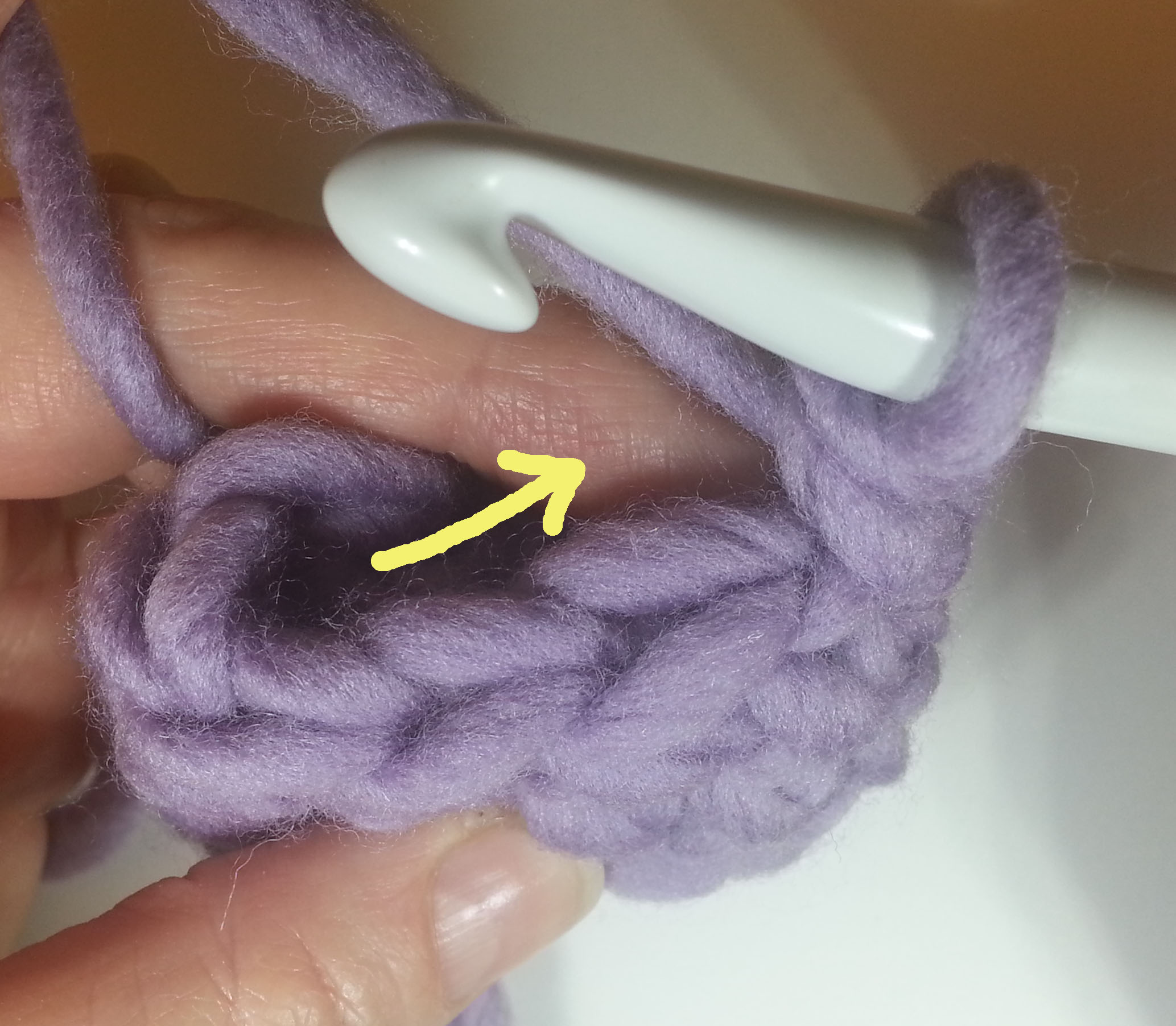 To avoid splitting your yarn look for the little gap on the side of your stitch just under that V.