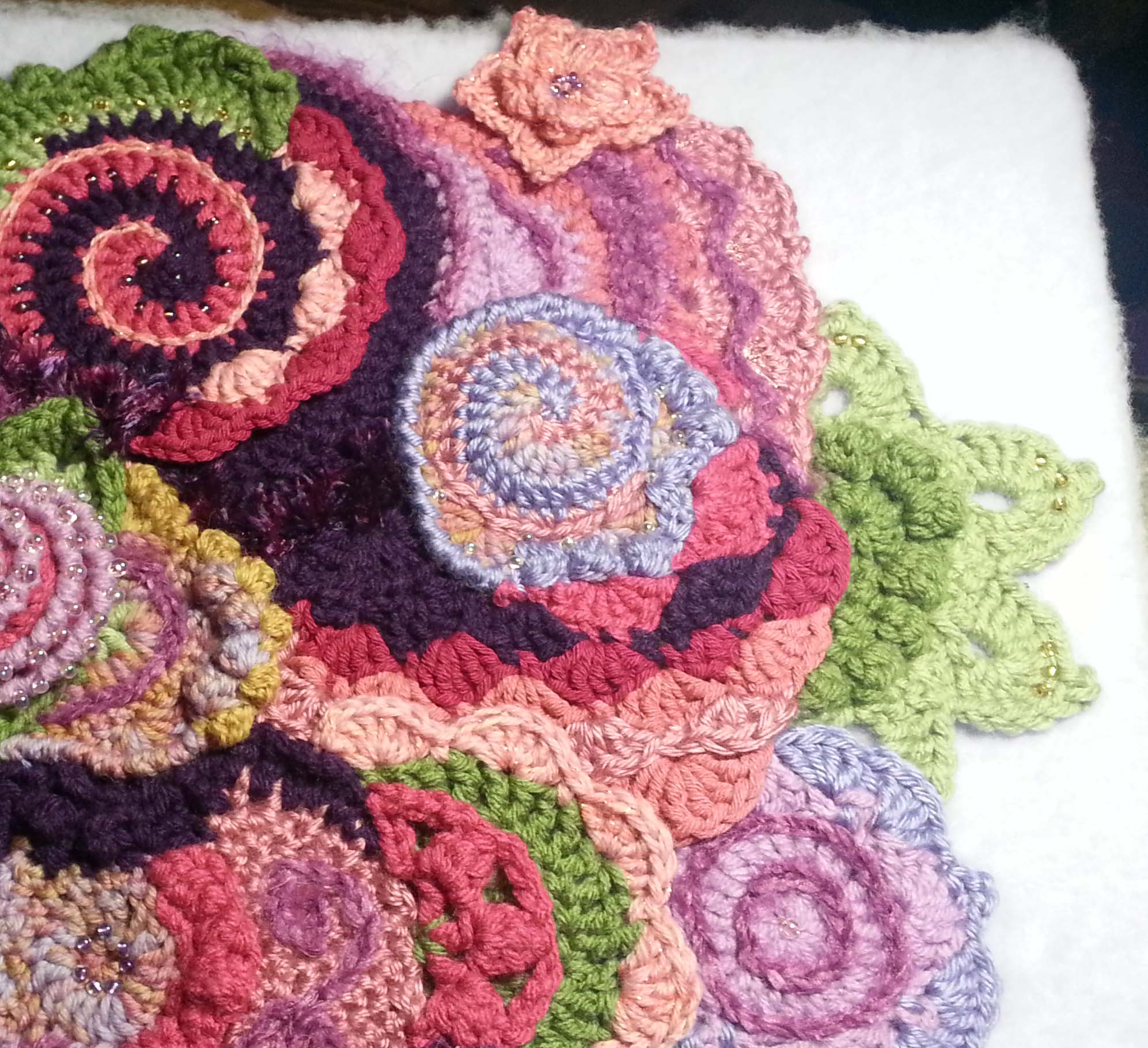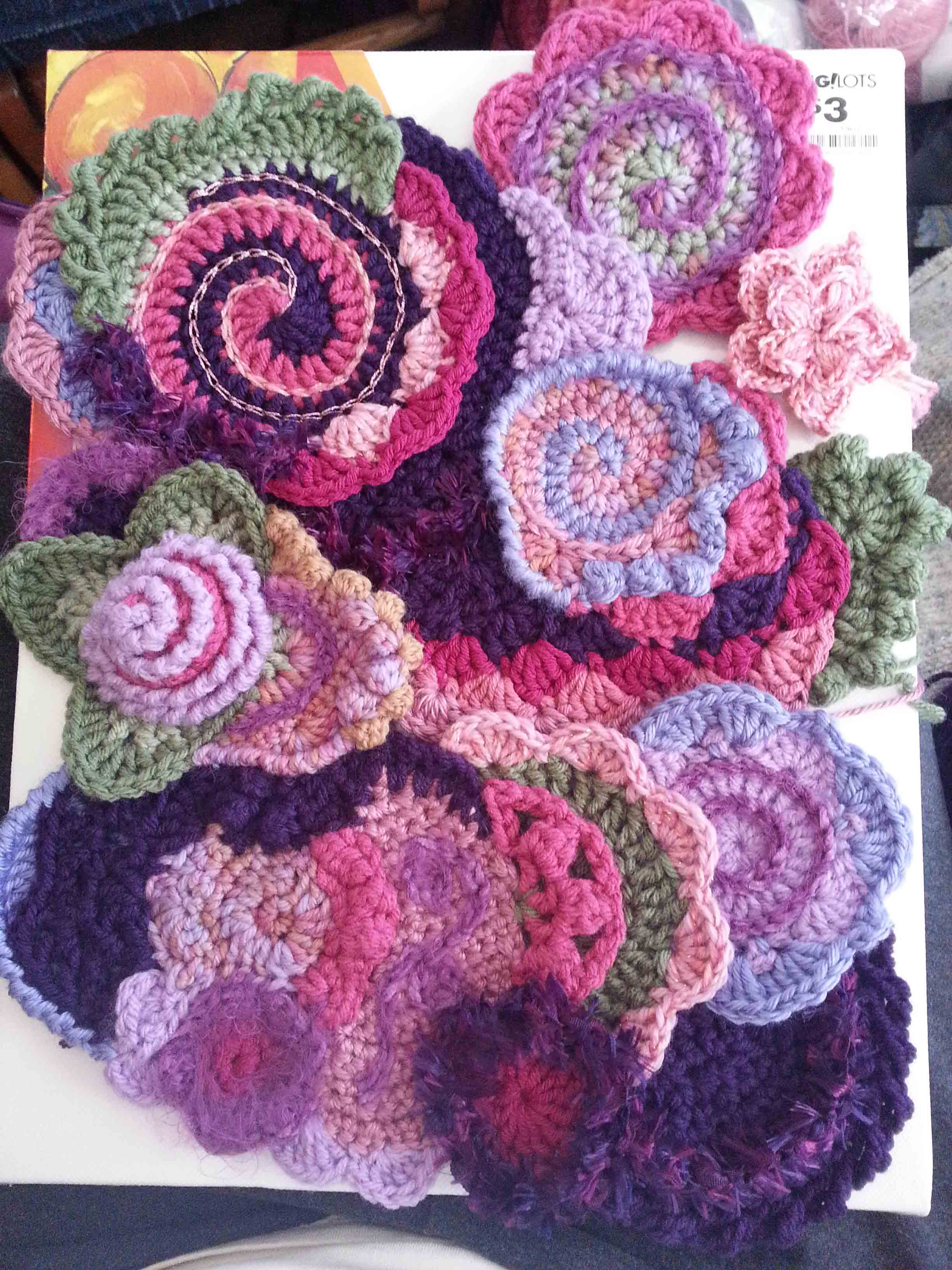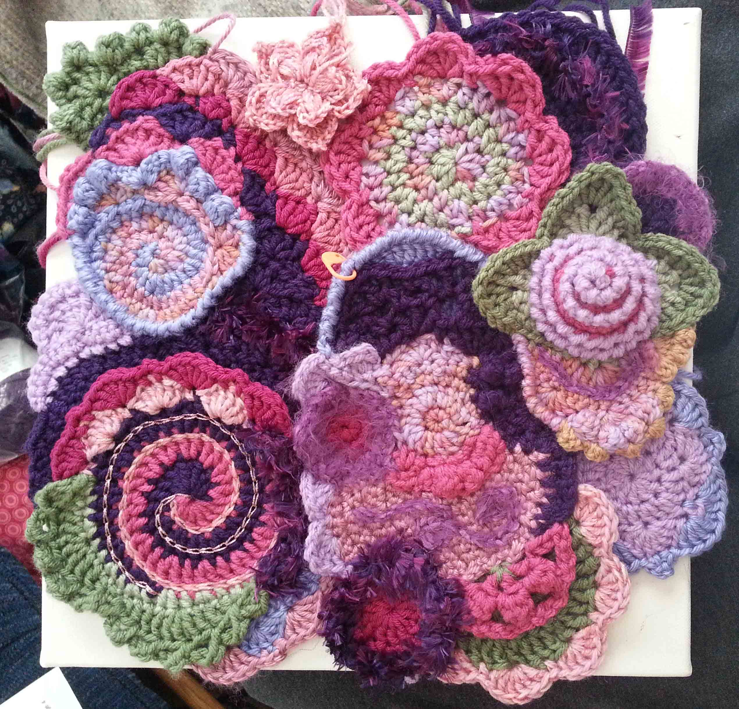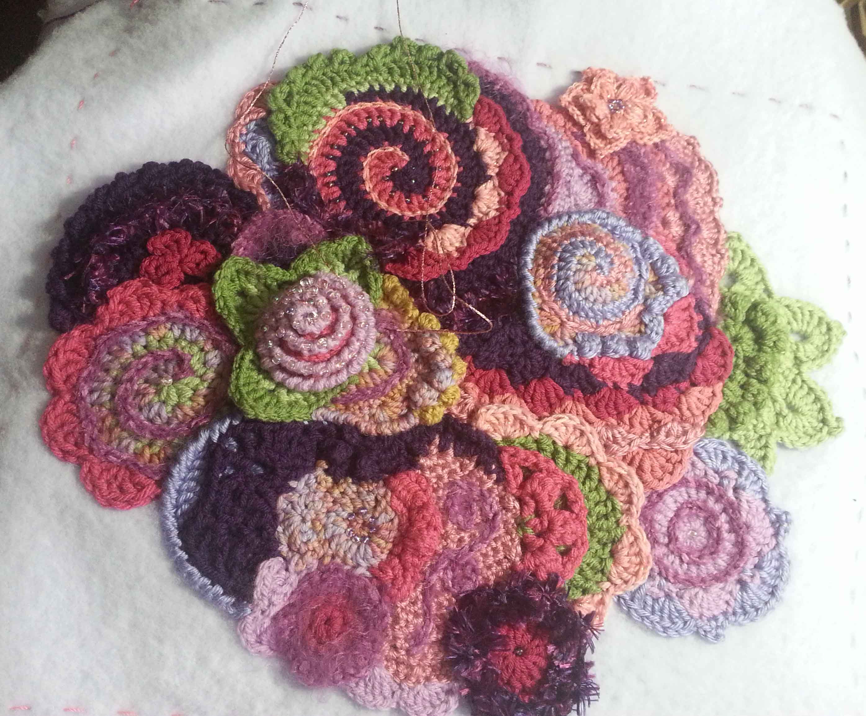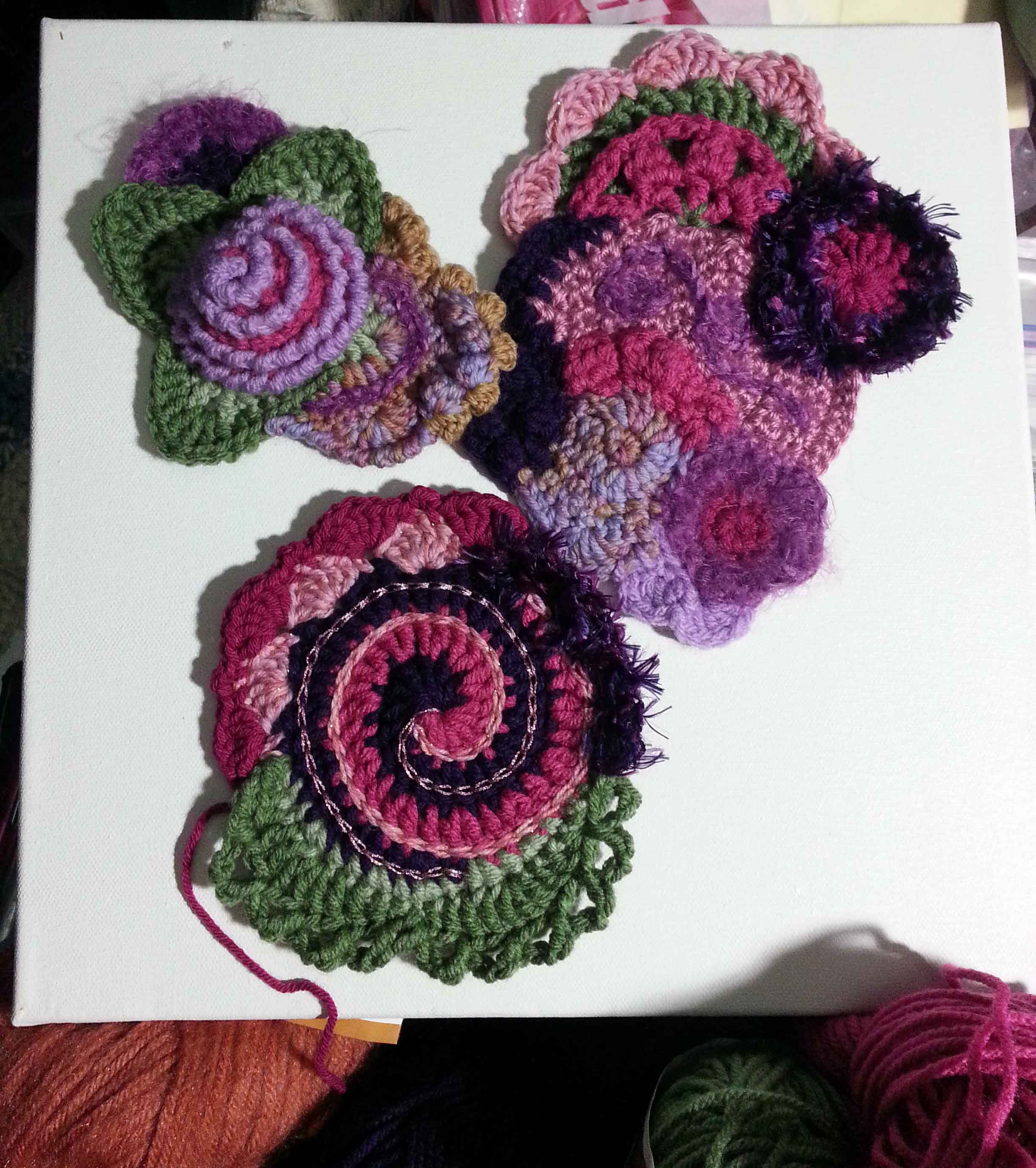 In free form crochet I often don’t know for sure where I am heading with an idea until I have worked a few scrumbles, that is the name many free-formers call for the smaller pieces created). I started this project with some scrumbles I created in my class with Myra. I knew I wanted to make a small piece that could be hung on a wall. Texture and 3 dimensional shaping were both in my mind as I began to create more pieces and add onto my existing pieces.