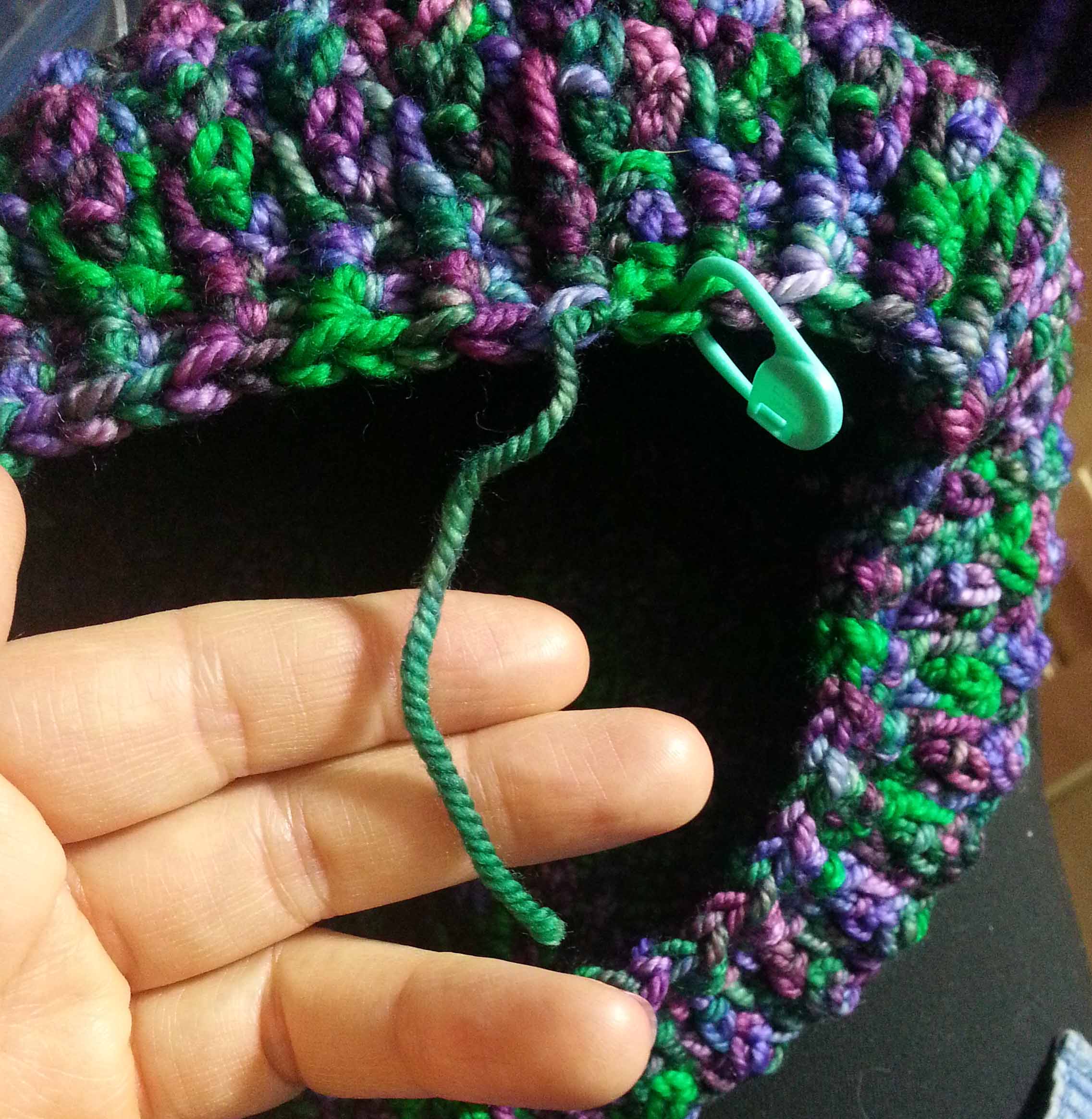 I was using the left-overs from a skein of yarn I purchased at the Estes Park Wool Market a few years back. Textiles A Mano’s “La Jolla” a 40% Silk – 60% Wool blend worsted/aran weight yarn. I don’t know if they are still around as I didn’t see them at the wool market this summer and couldn’t get to their website when I was writing this post.