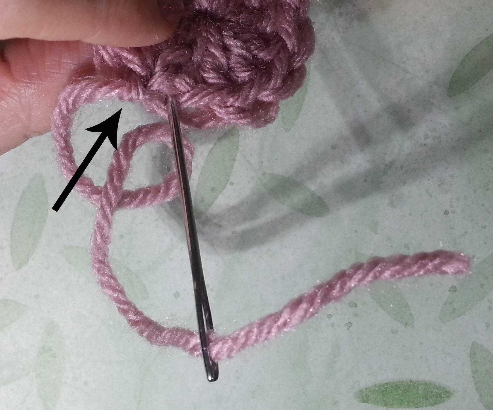 Weaving in the ending tail. Arrow indicates the slip stitch.