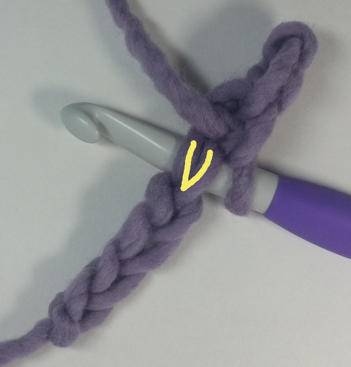 One of the first ways I learned to work into a chain was by going into the center of the V on the top of the chain and catching the back bar and top leg of the V in the stitch being made. This is the more traditional way of working into a foundation chain.