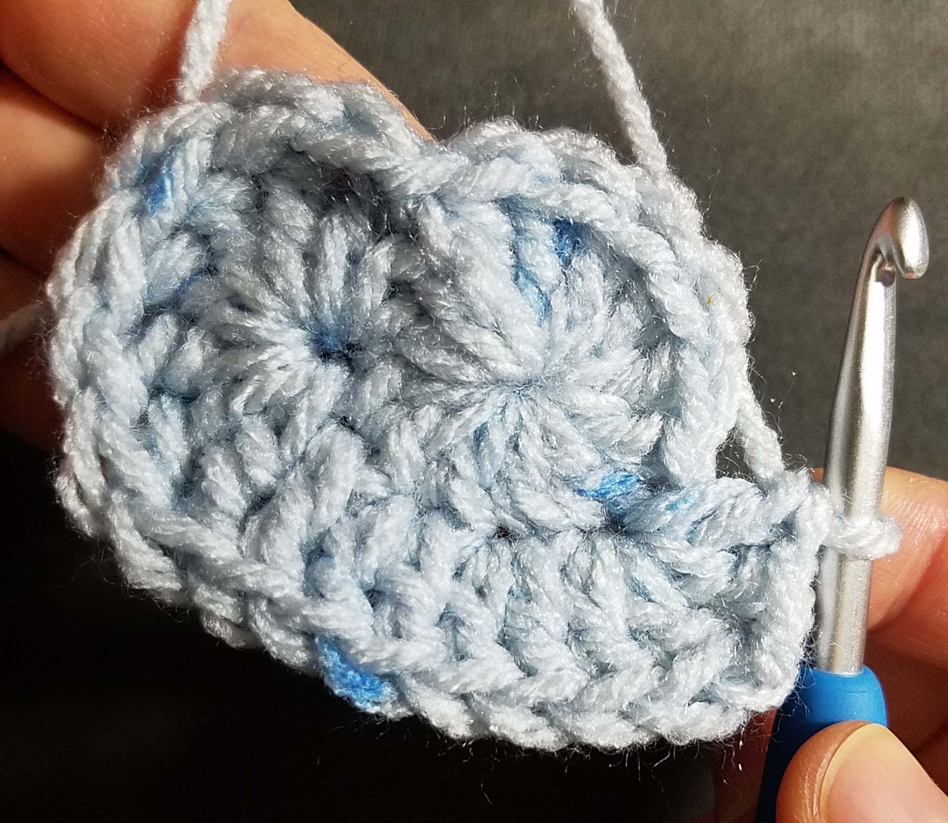 Make the next 2 dc stitches in the same stitch of Round 1 as before, and continue following the stitch instructions for Round 2.