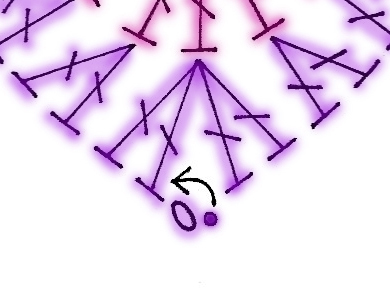 This is a close-up of the stitch diagram for the point of the heart. The conventions for showing the orders of operation in diagrams have the arrow pointing under the chain stitch, but you are actually working behind the chain stitch to get to the double crochet just made.