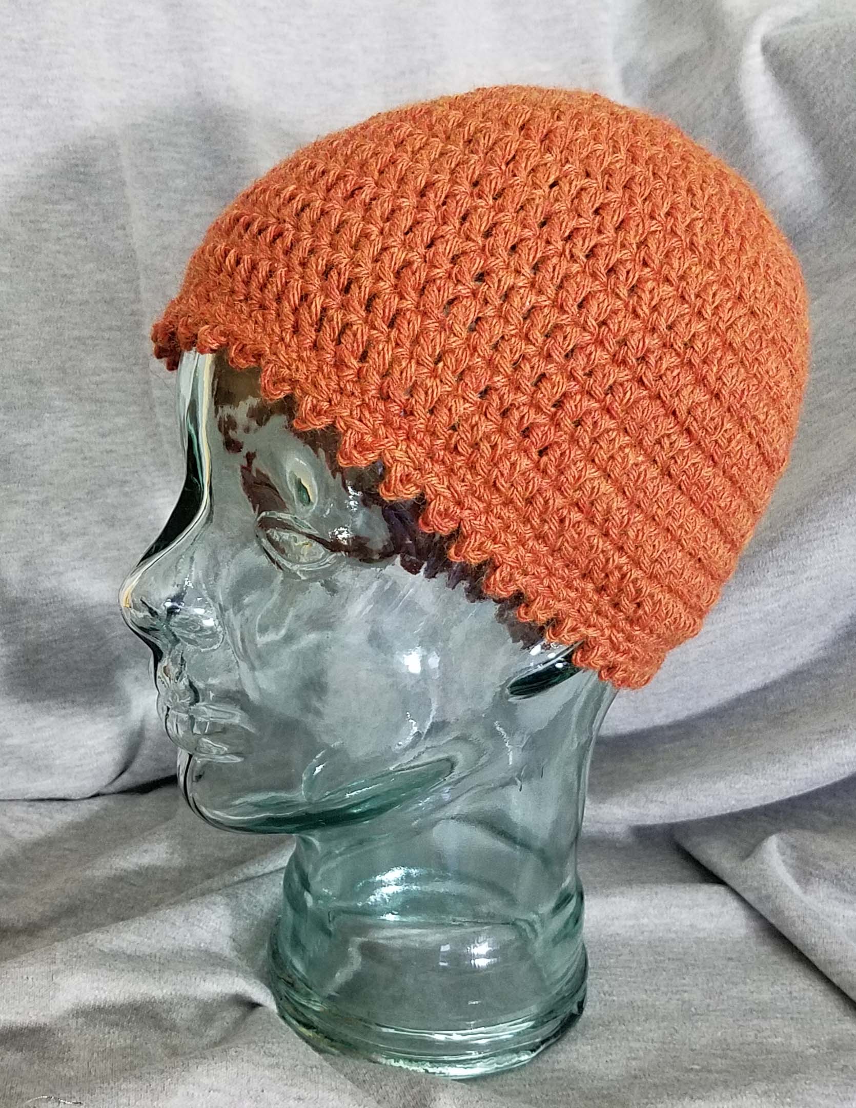 For another practice project, try making my “Simple Double Crochet Hat” but on the last round of the brim single crochets work a picot after each odd numbered sc.