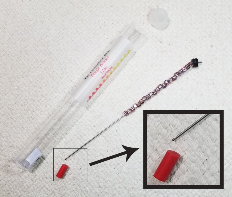 I also really liked that I could load the tool up with beads, cap it with the red stopper, pop it in the tube and bring it along in my project bag when I am on the go. Then, each time I want to add a bead to my project it is ready, without the usual juggling act.