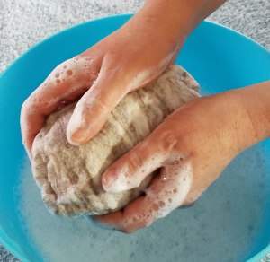 Now it was just all about working the wet felt to shrink it snugly around the foam core. This is the really wet and messy stage of this project. I also think I had a bit too much soap in my water. I alternated going to my kitchen sink and rinsing my rock with cold water to shock the fibers further, and working with the hot soapy water.