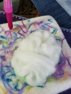Before I started with that fiber though, I wanted to add a bit of my plain wool to the flat sides of my foam rock. Of course, my handy felting needle came out for this part of the project. I used the felting needle to tack the wool to the foam, just enough that it wouldn’t come loose.