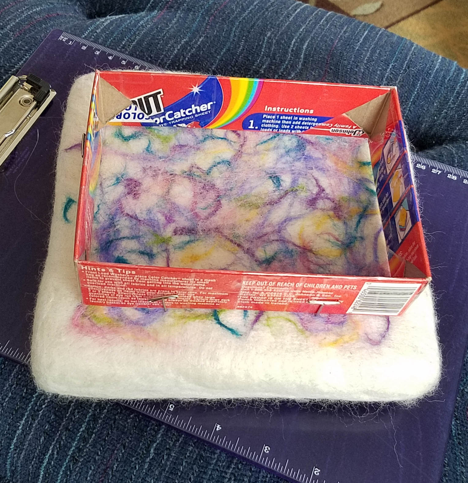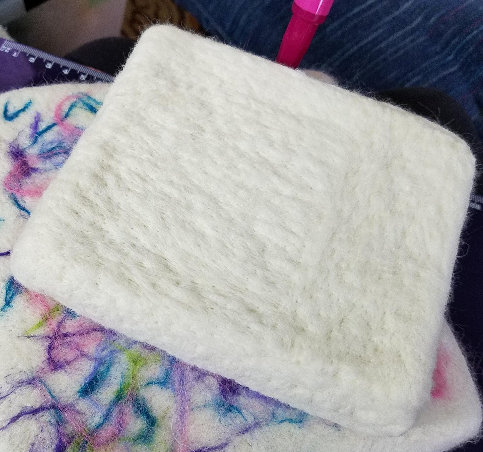 I had finally gotten it felted well and I set it out to dry overnight. It was still a bit furry looking and had some odd shaping issues on the “bottom” side. I knew I would be doing a little “fixing” with my felting needle once it was dry again.