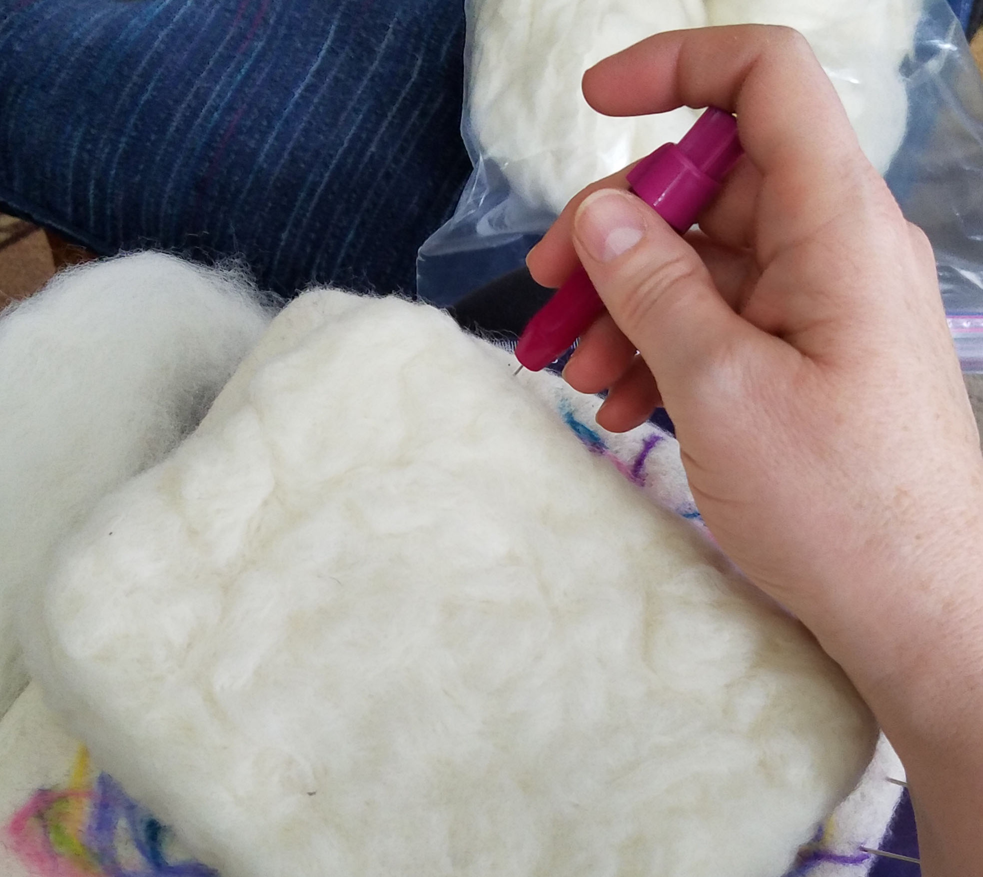 Before I started with that fiber though, I wanted to add a bit of my plain wool to the flat sides of my foam rock. Of course, my handy felting needle came out for this part of the project. I used the felting needle to tack the wool to the foam, just enough that it wouldn’t come loose.