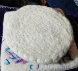 After watching a few videos of this I began to wonder if I could felt or “full” a crocheted fabric this way. If nothing else, it would be a good experiment. My first step was to get my pencil roving circle wet.