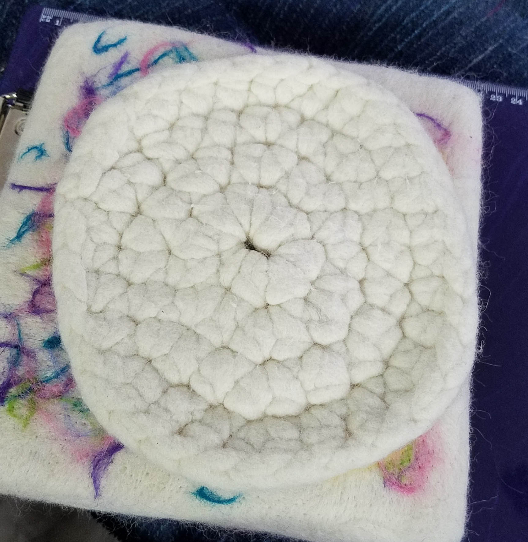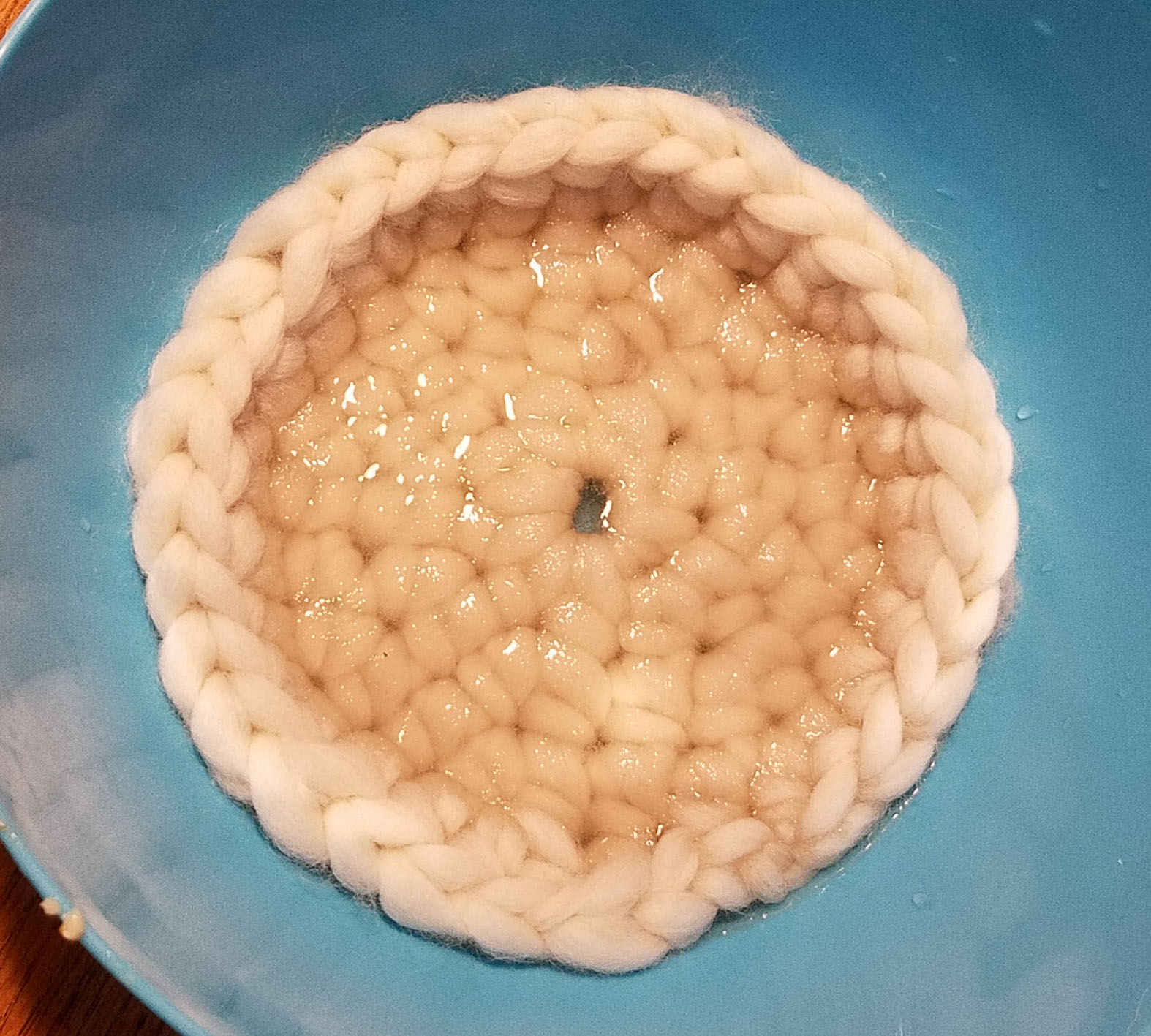 After watching a few videos of this I began to wonder if I could felt or “full” a crocheted fabric this way. If nothing else, it would be a good experiment. My first step was to get my pencil roving circle wet.