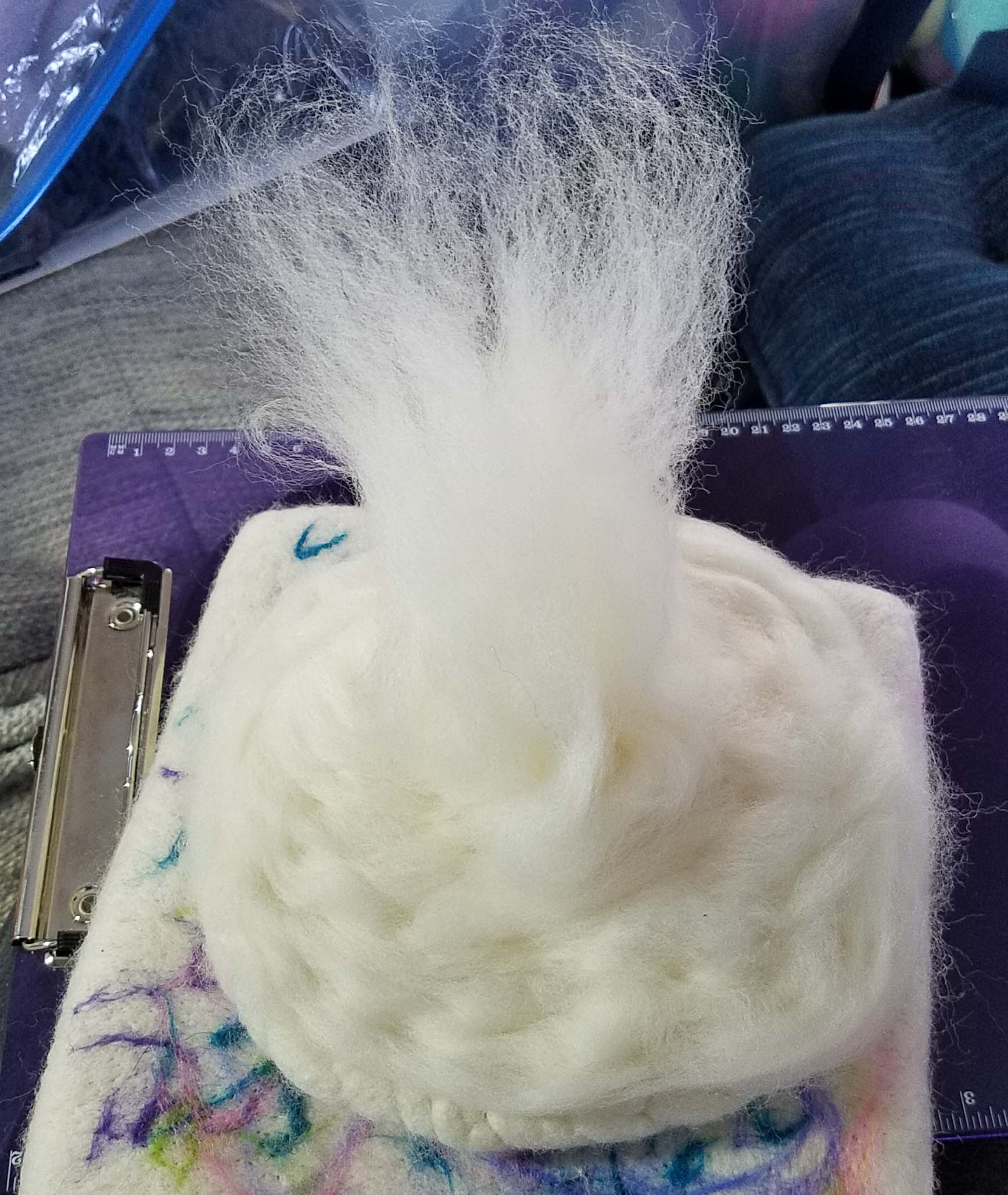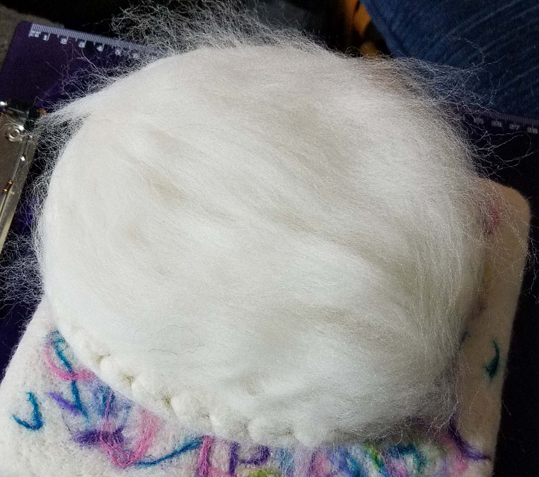 The needle felting method I used was somewhat similar to what I’ve shown here before. I started by covering one side with a thick fluffy mat of fiber.