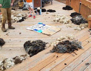 Daniel pulled out one of Margie’s fleeces to see how we had done on our skirting work and to give us some pointers for next year. He told us we had actually done a pretty good job and showed us some of the stuff to watch out for next time. Margie and I had been talking about next year that we should skirt the fleeces as the shearers finished them. That way the messy stuff doesn’t get bundled into the good part of the fleece.