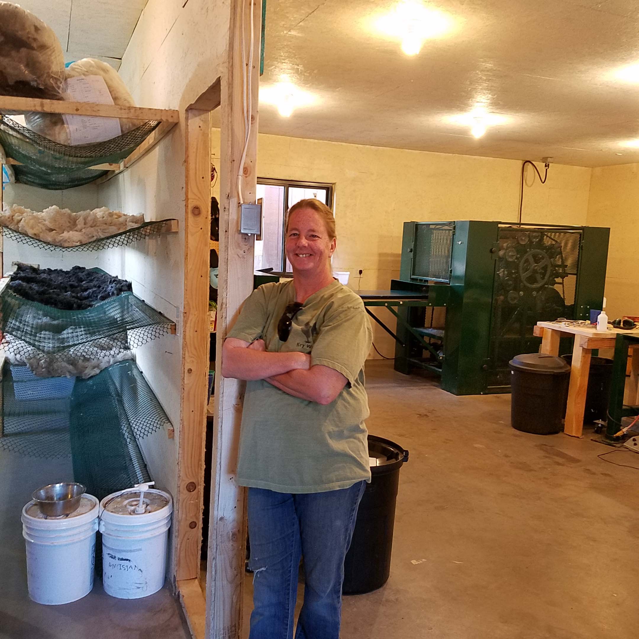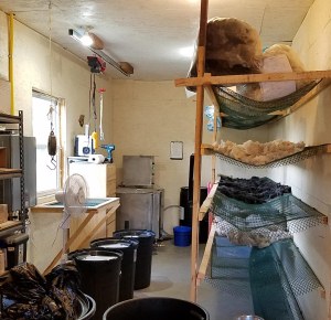 This is the area where it all begins. You can see there were already a number of fleeces on the drying shelves. In the far left corner is the big washing machine that the fleeces are cleaned in. The hook hanging in front of the window is where the fleeces were weighted. Margie’s fleeces had a total weight of 35 pounds. A lot of that will be lost once all the processing is finished. A big part of the weight is the “grease” in the wool.