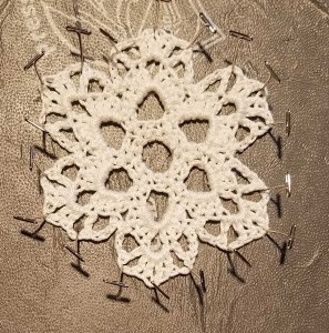 It can be helpful to also place pins in the center of the snowflake after securing the first 2 points. This is especially helpful with really open stitch work, it will keep the other 4 points from pulling it off center. I remove the center pins once I’ve got the 6 points secured.