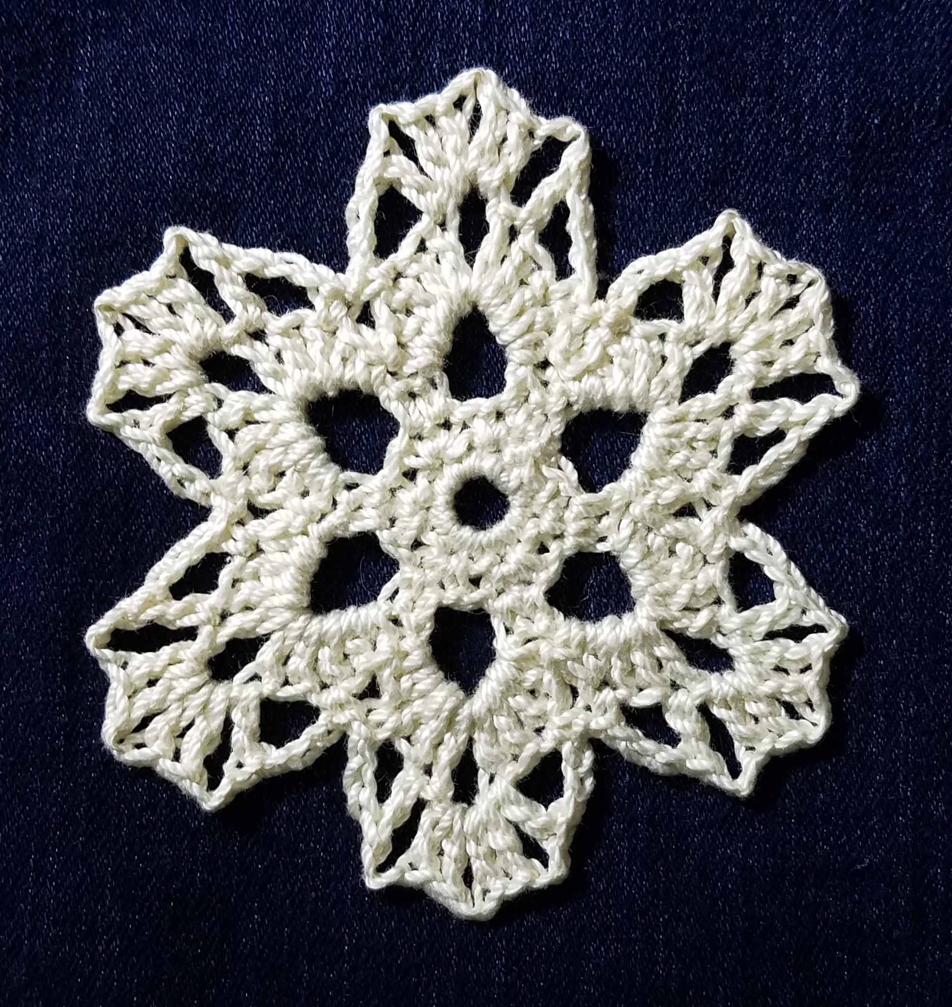 Weave in all ends. Block snowflake and use favorite stiffening method.