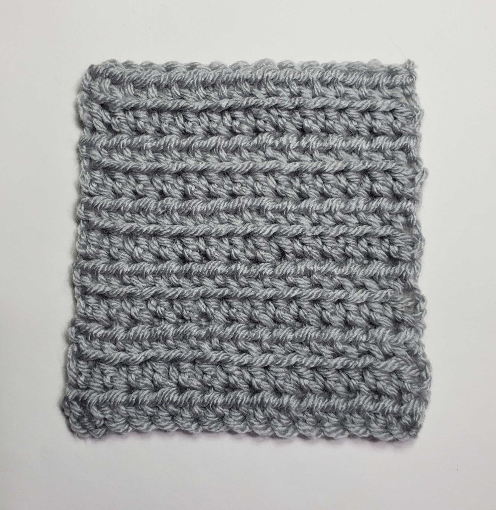 Row 2: Ch 2, turn, hdc in back bar and front loop of each st to end of row.