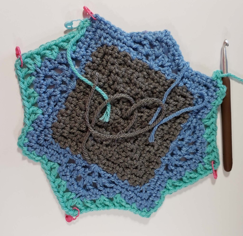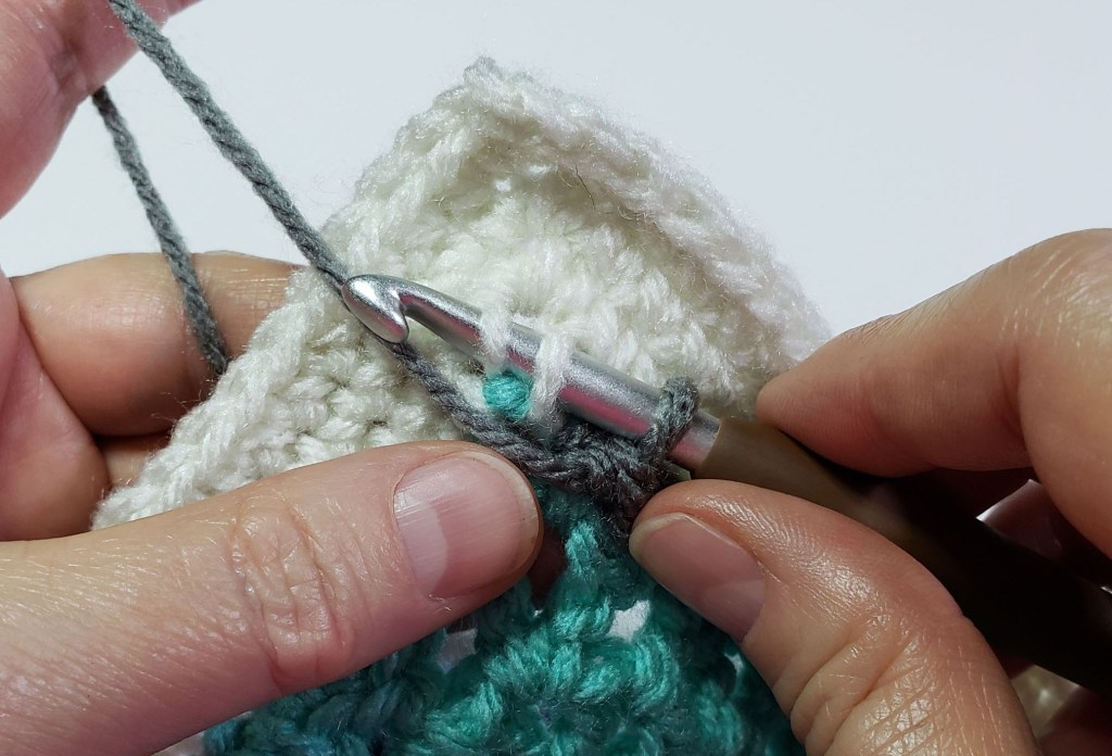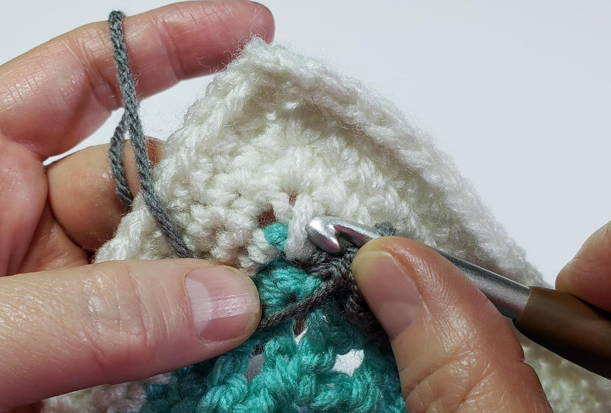 Inserting hook using inside strands of the 2 corner sc from Round 16.