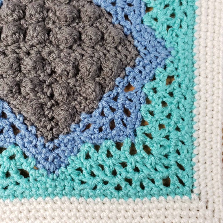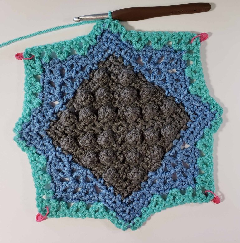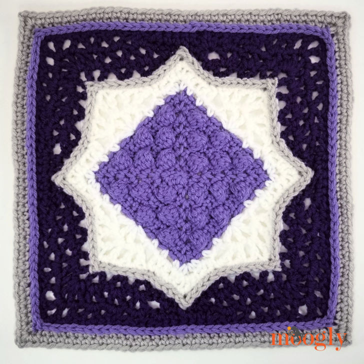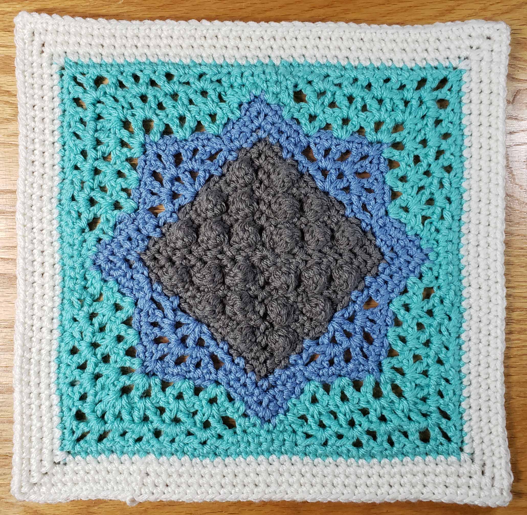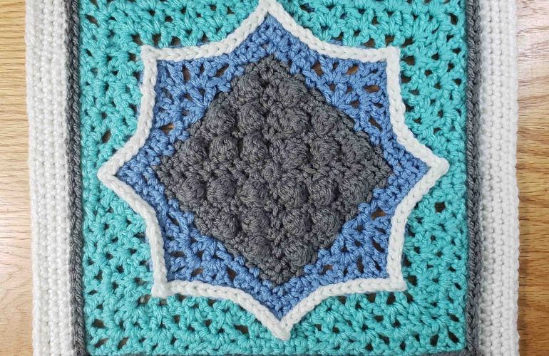 First 2 rounds are worked without turning, then Rounds 3-8 are worked in turned rounds. Round 9 will be joined and worked in same direction as Round 8. Rounds 10 – 15 are worked in turned rounds. Rounds 16-19 are worked without turning. It is important that Cluster stitch rounds are worked as wrong side rounds to be sure that they “pop” to the right side of the square.
