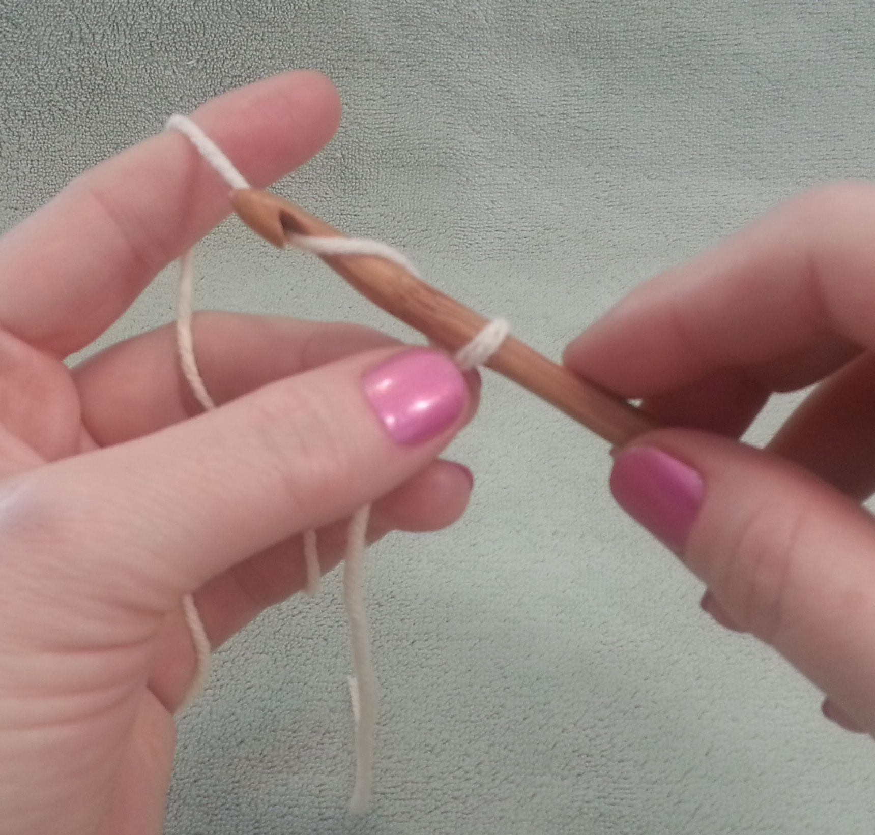 I scoop the tip of my hook from the front to the back of the strand of yarn coming from my index finger, then “hook” the yarn and pull it thru the loop on my hook.