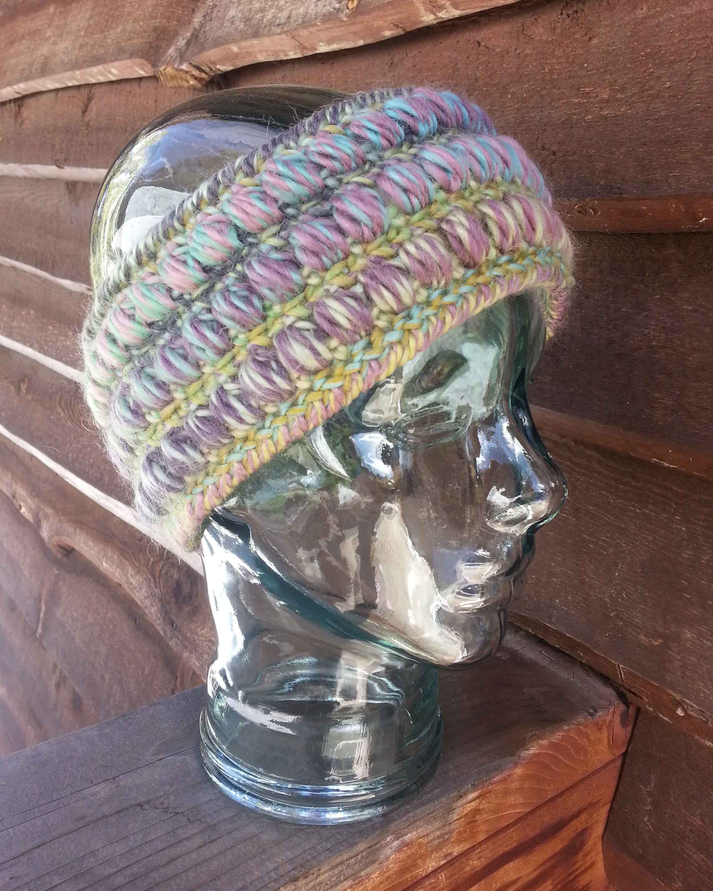 Puff stitches tend to sit centered in the fabric, which makes them a great stitch to use in scarves, since the texture is visible on both sides of your fabric. In the case of this headband project we are framing the puff stitches with hdc stitches. Like with our cluster stitches this “framing” helps the stitch sit on the backside of the row and creates a 3D effect on the finished project.