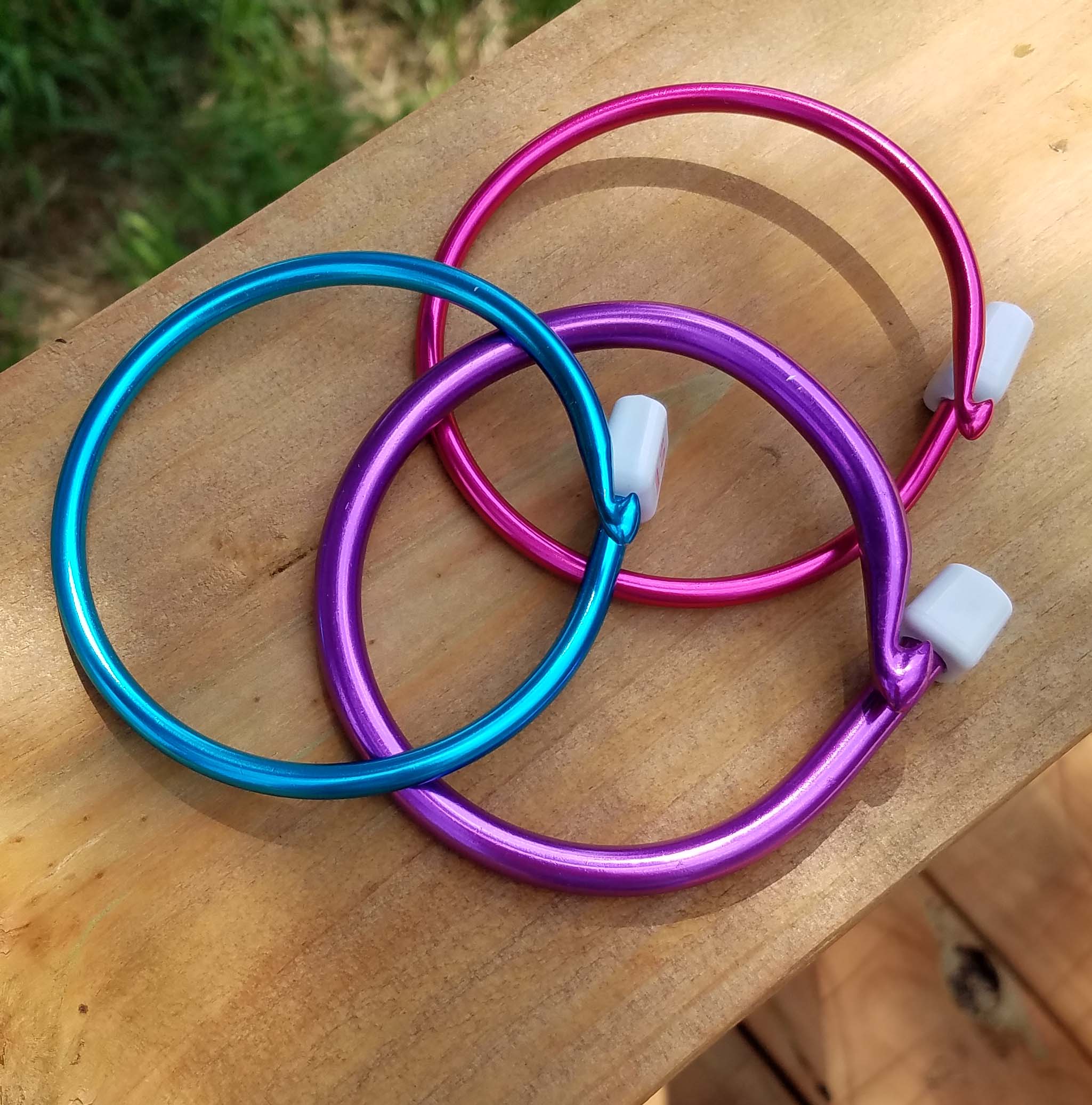 Despite being late to the opening I manage to do a little retail therapy that evening. These lovely bangle bracelets caught my eye right away. They are made from Tunisian crochet hooks that are “seconds” from the manufacturers. Then the folks at “Renegade Yarns” bend them into circles to create the bangles. I actually bought 4 of them, the 3 you see above and a green one as a gift for Jan.