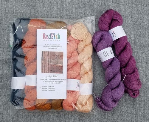 I had to stop by and see my friend Elf at RedFish DyeWorks. She always has such amazing colors and yarns. I couldn’t resist this “Starter Pack” dyed in colors picked from the photograph you see on front. I wanted to add a bit of purple to the palette too, but couldn’t decide on which one, so I got both. I have something very creative and exciting planned for this yarn.