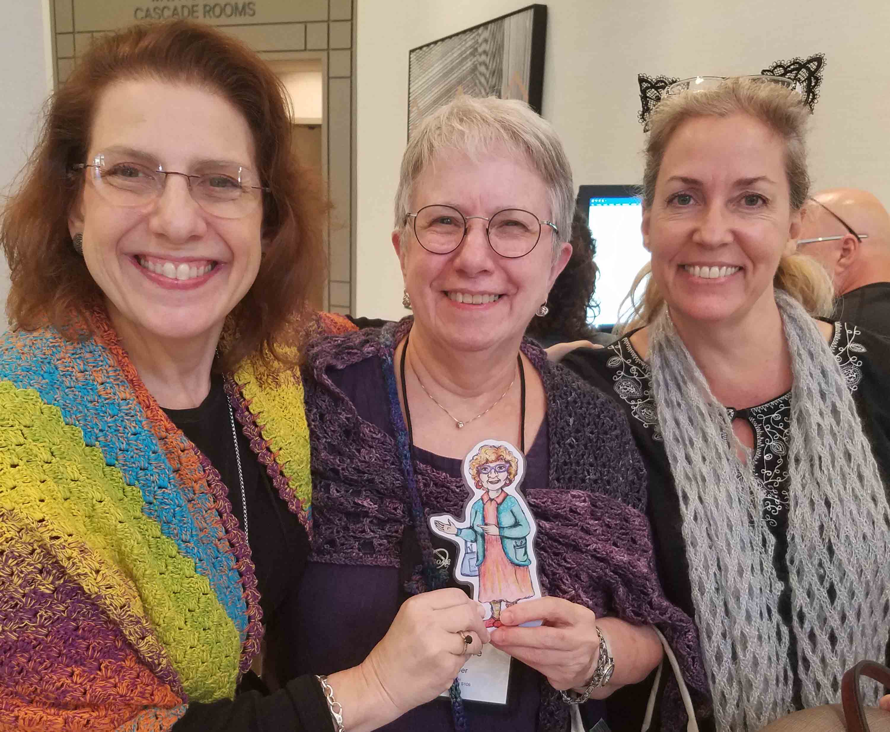 Friday evening was the Excellence in Crochet event, where the winners of the Design Competition would be announced. There was quite a line waiting to get in because everyone wanted to get a Goody Bag. I got to spend some time with some of my favorite folks while we waited. That is Shari White, Pam Shore and Vashti Braha hanging out with Florence.