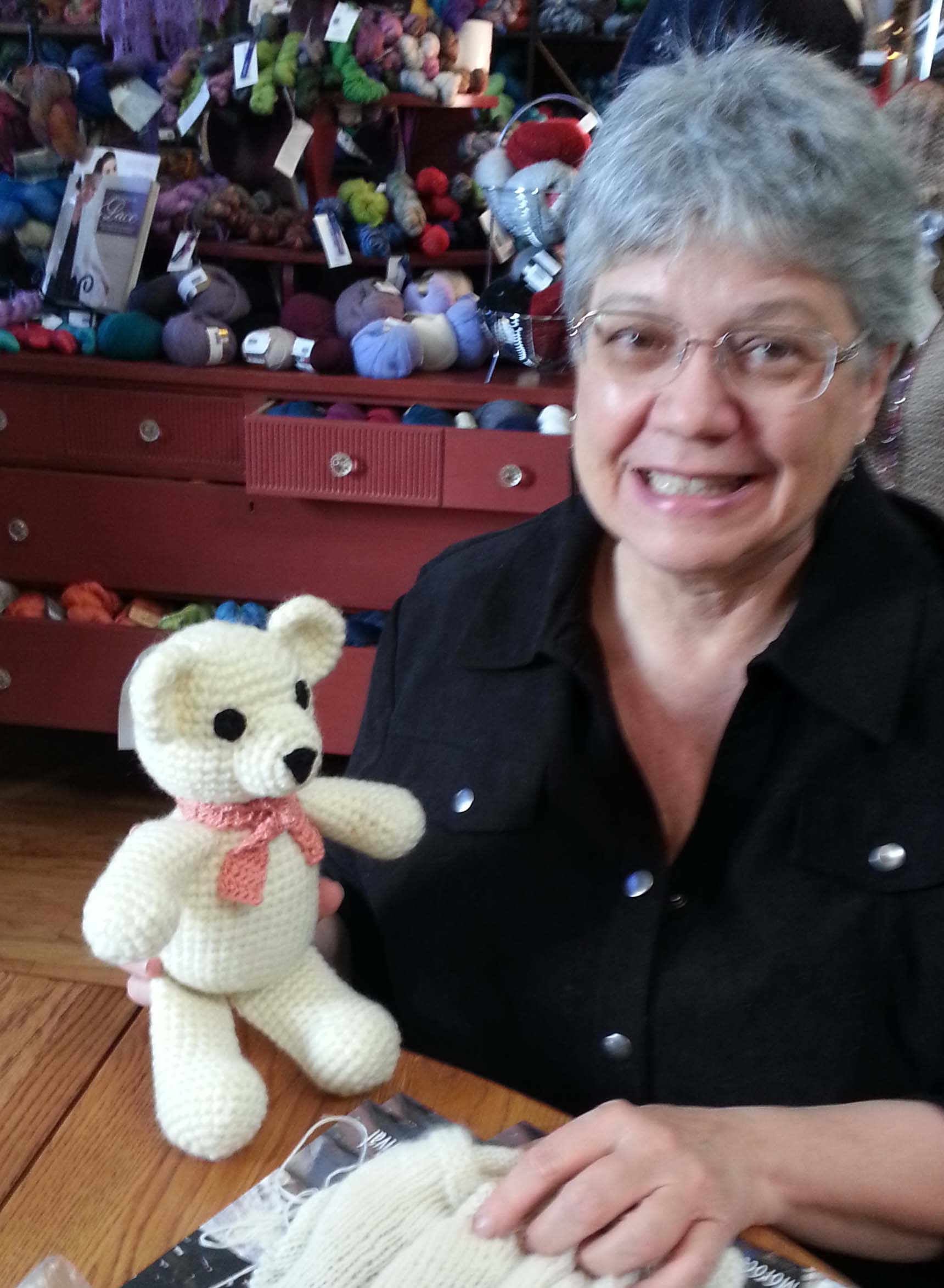 Today was our local CGOA Chapter meeting and I brought in my nearly finished bear. I facilitate the meetings, so I wanted to demonstrate how I sew my bears together. I had filled the arms and legs and head with stuffing and brought stuffing for the body. By the end of the meeting I had finished the bear and given him to my friend Kathy that is organizing this effort. My friend Margie wins the prize for the most bears completed. She brought in all these bears. She said she cheated a little as these were bears she had made on a knitting loom and were just waiting to be finished with stuffing and bows. Kathy and I both said, they still count and will be very appreciated. Before my little bear left the shop, he had a cuddle with some wonderful Malabrigo. I am feeling very inspired with ideas about how I want to design my bear. Hopefully I will have a prototype worked up by Christmas time.