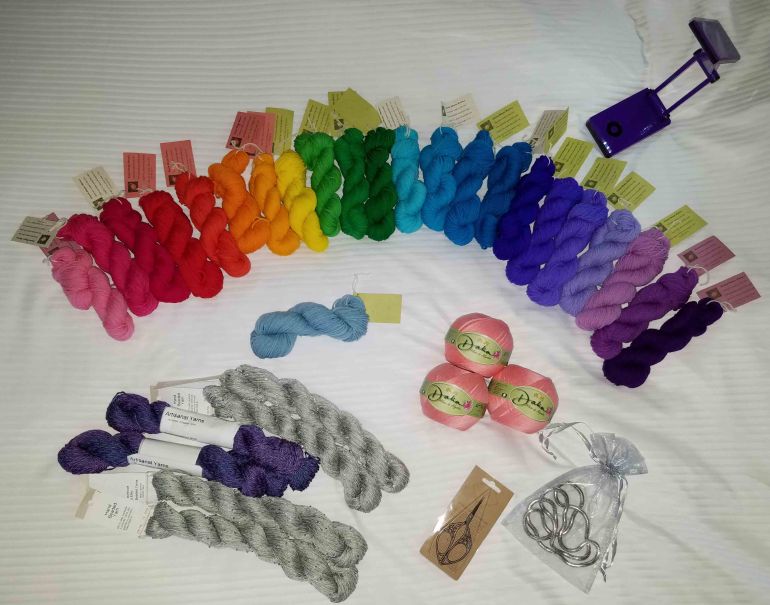 Unfortunately, I didn’t have the brilliant idea to take a photo of all the items in the bag together until much later, after I had emptied the bag and tucked the various goodies into my suitcases. This is a pile of all the yarn that was in my giftbag that evening.