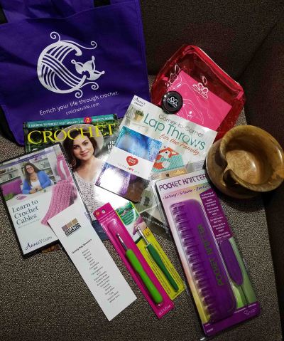 I’m not sure what the numbers were, but the first 100 or so folks coming to the meeting received an awesome gift bag. The bags themselves were from Crochetville. They were a gorgeous purple lightweight backpack with a zipper pocket. The bags were stuffed full of yarn, crochet tools, crafting booklets and loads of coupons. I think everyone that received one was amazed and pleased with them.