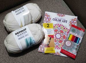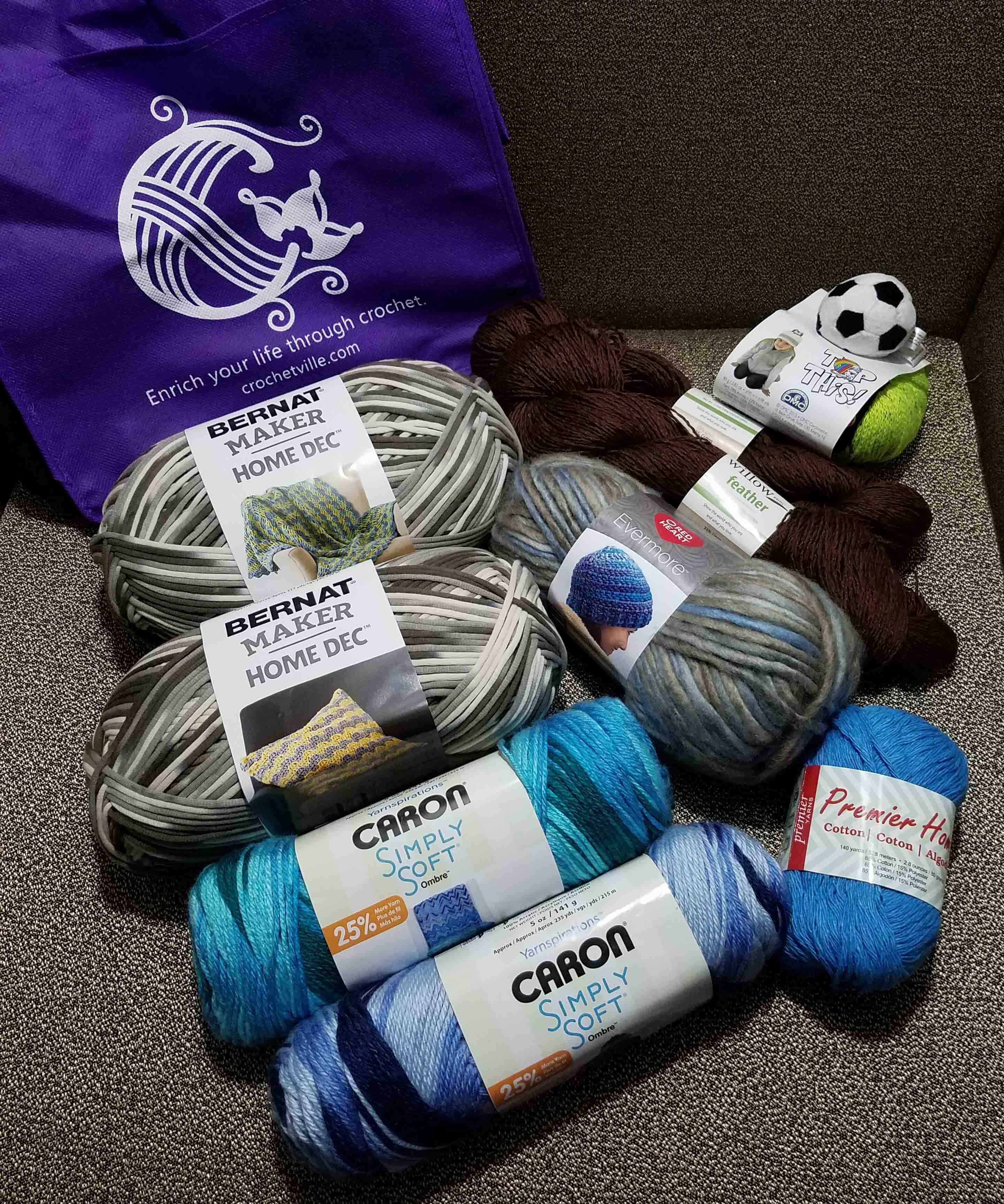 The Goody Bag was full of all kinds of fun stuff. Lots of yarn, both full size and sample sizes. Some wonderful pattern books and magazines also. The bag was from “Simply Crochet” magazine and it says, “Eat Sleep Hook Repeat”. They know us crochet folks well.
