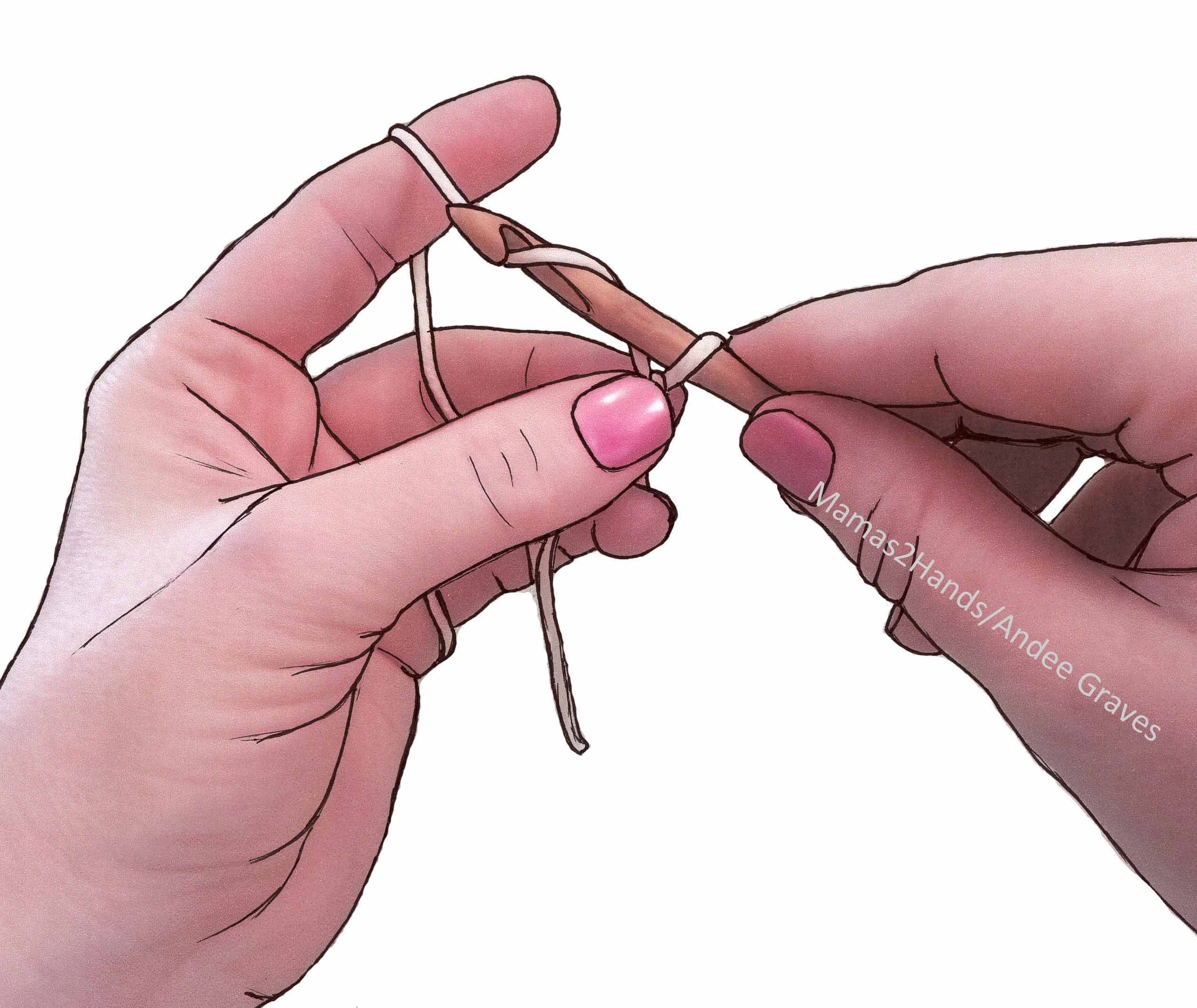 Start square with an adjustable slip knot. Beginning tail tightens the loop on the hook.