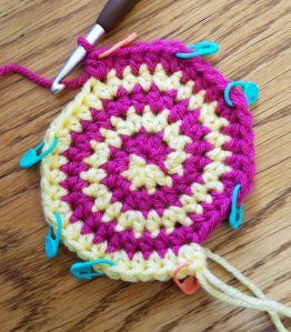 To prepare for working round to square, remove every other st marker leaving 4 markers equally spaced around circle.